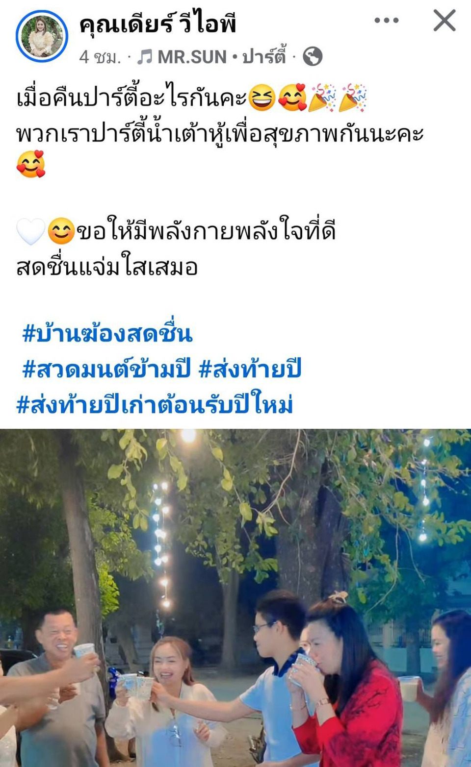 จากกรณที่มีเฟสบุ๊คชื่อ คุณเดียร์ วีไอพี ได้โพสต์คลิปปาร์ตี้ฉลองปีใหม่โดยในคลิปมีการชนแก้วกันและดื่มกินอย่างสนุกสนาน แต่ที่แปลกและไม่เหมือนใคร เพราะการฉลองปีใหม่ของคนอื่นจะเป็นเครื่องดื่มที่มีส่วนผสมของแอลกอฮอล์ แต่คนกลุ่มนี้ฉลองปาร์ตี้เค้าท์ดาวในช่วงปีใหม่กันด้วยน้ำเต้าหู้ พร้อมโพสต์ข้อความว่า เมื่อคืนปาร์ตี้อะไรกันคะ พวกเราปาร์ตี้นํำเต้าหู้เพื่อสุขภาพกันนะคะ ขอให้มีพลังกายพลังใจที่ดี สดชื่นแจ่มใสเสมอ #บ้านฆ้องสดชื่น #สวดมนต์ข้ามปี#ส่งท้ายปี #ส่งท้ายปีเก่าต้อนรับปีใหม่ ซึ่งภายหลังได้โพสต์ลงในโชเซียล ได้มีคนเข้ามากดไลท์และแสดงความคิดเห็นกันเป็นจำนวนมาก ซึ่งส่วนใหญ่เห็นด้วยกับการฉลองที่ไม่ต้องมีแอลกอฮอล์