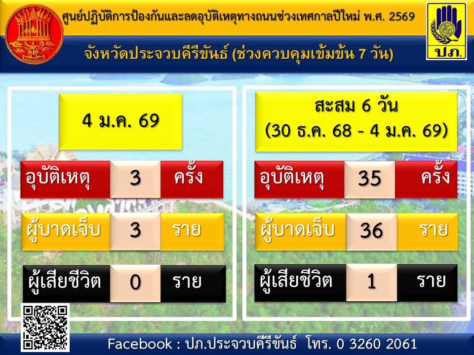 ประจวบคีรีขันธ์ สรุปสถิติ 6 วันอันตรายปีใหม่ 2569 เกิดอุบัติเหตุ 35 ครั้ง บาดเจ็บ 36 ราย เสียชีวิต 1 ราย รถจักรยานยนต์ยังเป็นยานพาหนะเกิดเหตุสูงสุด ทางการย้ำคุมเข้มความปลอดภัยต่อเนื่อง