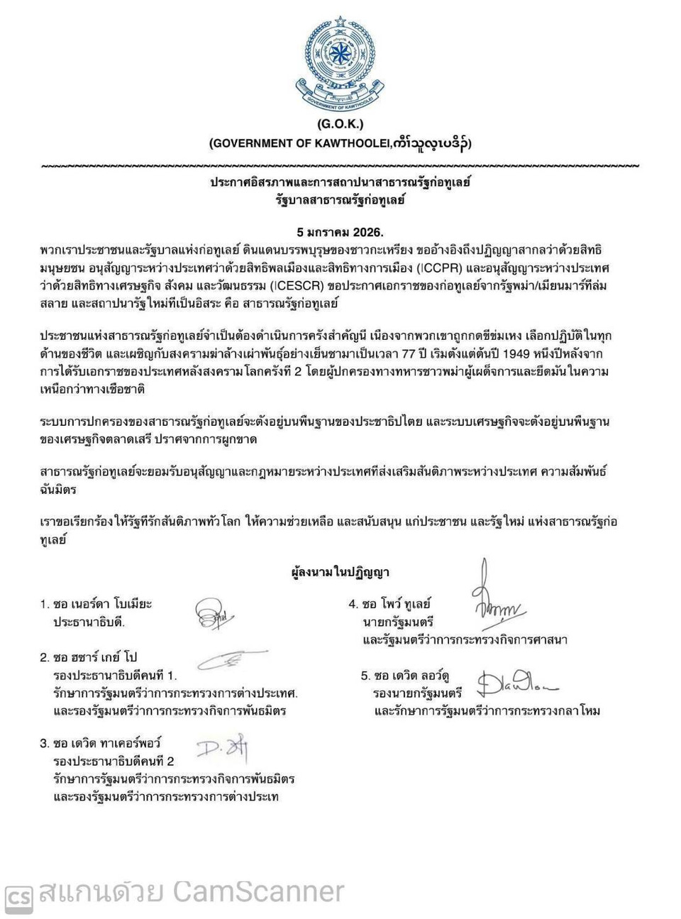 รายงานข่าวแจ้งว่า ถือเป็นวันประวัติศาสตร์สำคัญของชนชาติกะเหรี่ยง เมื่อมีการประกาศแยกตัวเป็นอิสระ และสถาปนารัฐใหม่อย่างเป็นทางการในนาม “สาธารณรัฐกอทูเลย์ (Government of Kawthoolei)”