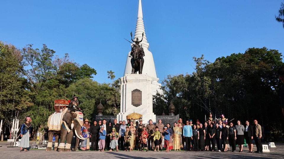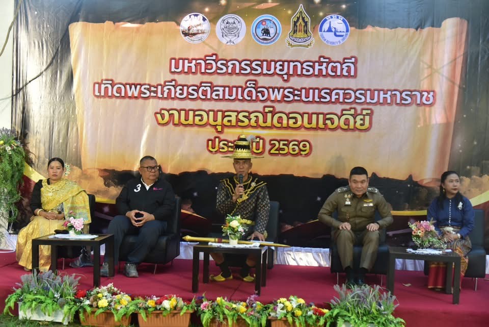 วันที่ 7 ม.ค.69 ที่บริเวณลานโพธิ์ข้างพระบรมราชานุสรณ์ดอนเจดีย์ อำเภอดอนเจดีย์ จังหวัดสุพรรณบุรี นายณัฐพงษ์ สงวนจิตร ผู้ว่าราชการจังหวัดสุพรรณบุรี เป็นประธานแถลงข่าวการจัดงานอนุสรณ์ดอนเจดีย์ ครั้งที่ 67 ประจำปี 2569 พร้อมด้วย ผู้บังคับการตำรวจภูธรจังหวัดสุพรรณบุรี ที่ปรึกษานายกองค์การบริหารส่วนจังหวัดสุพรรณบุรี ผู้อำนวยการสำนักงานการท่องเที่ยวแห่งประเทศไทยสำนักงานสุพรรณบุรี และผู้แทนวัฒนธรรมจังหวัดสุพรรณบุรี ร่วมแถลงข่าว โดยมี นายกลวัชร ทรัพย์ส่งสุข รองผู้ว่าราชการจังหวัดสุพรรณบุรี นายกัมปนาท กลิ่นเสาวคนธ์ ปลัดจังหวัดสุพรรณบุรี หัวหน้าส่วนราชการ นายอำเภอ ผู้บริหารสถานศึกษา ผู้แทนภาคเอกชน อปท. อบต. สื่อมวลชน และประชาชน เข้าร่วม ซึ่งก่อนการแถลงข่าว มีการแสดงจำนวน 2 ชุด ได้แก่ การแสดงองค์ประกันหงษา ตอนประลองดาบ และการแสดงองค์ประกันหงษา ตอนประลองทวน