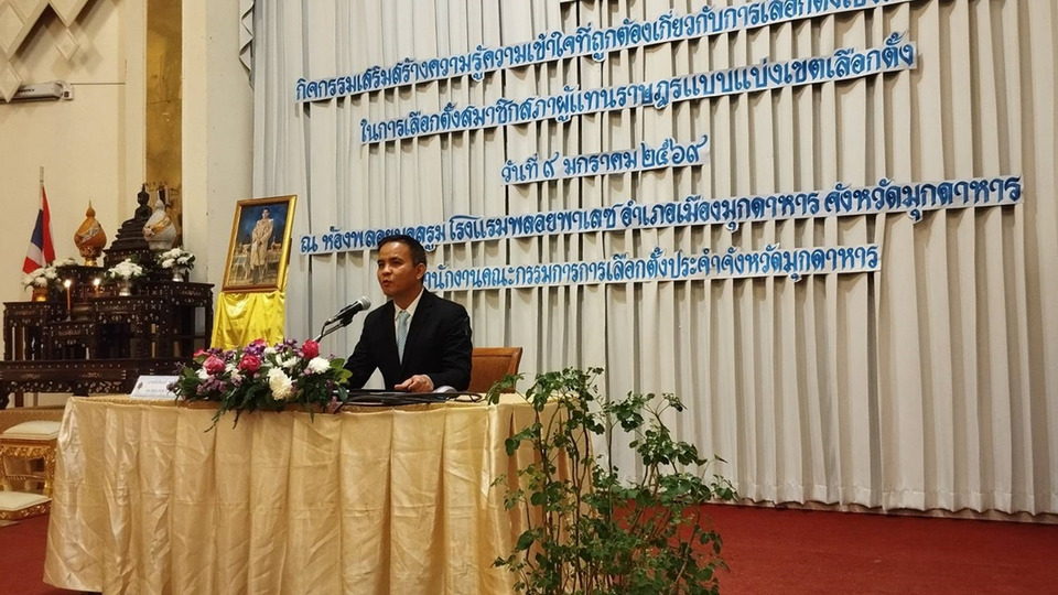 นายจักรินทร์ ชาลีพุทธาพงศ์ ผู้อำนวยการการเลือกตั้งประจำจังหวัดมุกดาหาร กล่าวว่า การจัดกิจกรรมเสริมสร้างความรู้ความเข้าใจที่ถูกต้องเกี่ยวกับการเลือกตั้งเชิงสมานฉันท์ ในการเลือกตั้งสมาชิกสภาผู้แทนราษฎร แบบแบ่งเขตเลือกตั้ง เพื่อสร้างความรู้ความเข้าใจที่ถูกต้องเกี่ยวกับการเลือกตั้งสมาชิกสภาผู้แทนราษฎร และมีส่วนร่วมในกระบวนการเลือกตั้งได้อย่างถูกต้อง ลดปัญหาเรื่องร้องเรียน ร้องคัดค้านการเลือกตั้งอันเกิดจากความเข้าใจผิดในสาระสำคัญของกฎหมายเพื่อให้การเลือกตั้งสมาชิกสภาผู้แทนราษฎร เป็นไปด้วยความสุจริต เที่ยงธรรมและชอบด้วยกฎหมาย จะเห็นได้ว่าสำนักงานคณะกรรมการการเลือกตั้งประจำจังหวัดมุกดาหารให้ความสำคัญกับการดำเนินการเพื่อให้ผู้สมัครรับเลือกตั้งสมาชิกสภาผู้แทนราษฎรไม่กระทำผิดทุจริตการเลือกตั้ง โดยอาศัยกลไกการจัดอบรมชี้แจงเพื่อให้ผู้สมัครได้มีความรู้ ความเข้าใจที่ถูกต้องและนำไปปฏิบัติเป็นไปในแนวทางเดียวกัน ลดการกระทำผิดทุจริตการเลือกตั้ง ให้การเลือกตั้งเป็นไปด้วยความสุจริต เที่ยงธรรม และชอบด้วยกฎหมาย หวังเป็นอย่างยิ่งว่าเมื่อเสร็จสิ้นการอบรมในครั้งนี้แล้วทุกท่านจะนำควานรู้ที่ได้รับไปเป็นแนวทางในการปฏิบัติเพื่อให้การเลือกตั้งสมาชิกสภาผู้แทนราษฎรของจังหวัดมุกดาหารเป็นไปโดยสุจริตและเที่ยงธรรมและเป็นไปโดยชอบด้วยกฎหมายตามที่ได้บัญญัติไว้ตาม พระราชบัญญัติประกอบรัฐธรรมนูญว่าด้วยการเลือกตั้งสมาชิกสภาผู้แทนราษฎร พ.ศ. 2561 และที่แก้ไขเพิ่มเติม และกฎหมายอื่นที่เกี่ยวข้องต่อไป