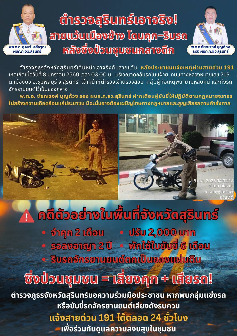 พ.ต.อ. ชัยณรงค์ กล่าวว่าการกวดขันจับกุมเป็นไปตาม นโยบายสำนักงานแห่งชาติ กองบัญชาการภูธรภาค 3 และกองบังคับการตำรวจภูธรจังหวัดสุรินทร์ ถ่ายป้ายการนำของ พล.ต.ต.สุคนธ์ ศรีอรุณ ผู้บังคับการตำรวจภูธรจังหวัดสุรินทร์ ด้วยความห่วงใยในชีวิตและทรัพย์สินของประชาชน กองบังคับการตำรวจภูธรจังหวัดสุรินทร์ ฝากเตือนผู้ขับขี่ให้ปฏิบัติตามกฎหมายจราจร ไม่สร้างความเดือดร้อนแก่ประชาชน มิฉะนั้นอาจต้องเผชิญโทษทางกฎหมายและสูญเสียรถตามคำสั่งศาล หากพบกลุ่มแข่งรถหรือขับขี่รถจักรยานยนต์เสียงดังรบกวน แจ้งสายด่วน 191 ได้ตลอด 24 ชั่วโมง เพื่อร่วมกันดูแลความสงบสุขในชุมชน