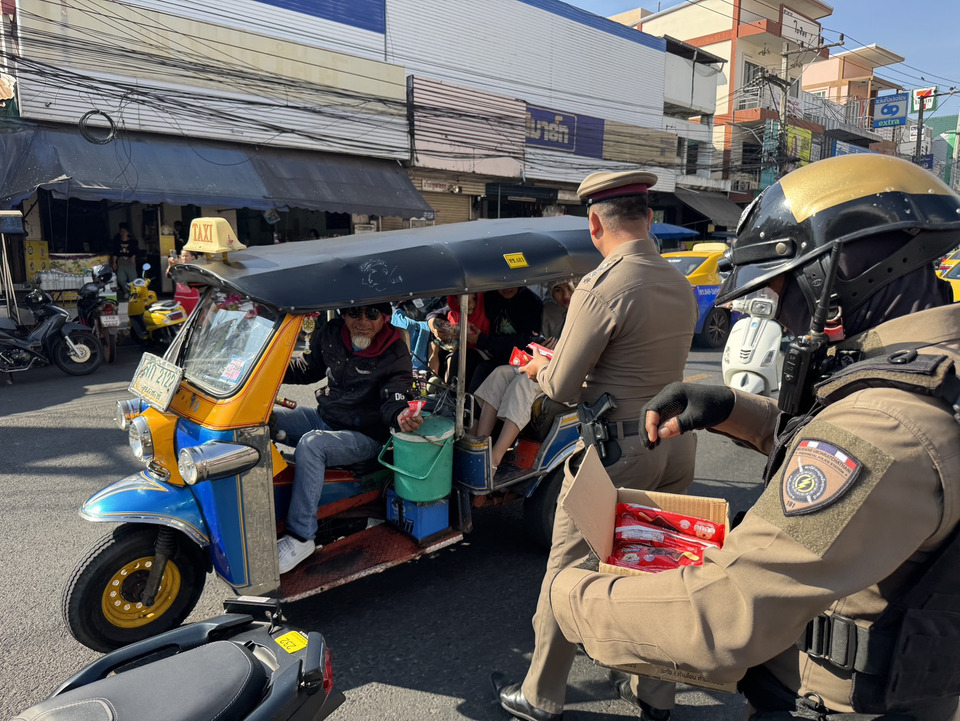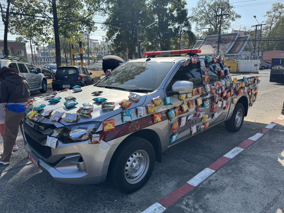 ตำรวจภูธร เมืองอุบลราชธานี นำรถโล่สายตรวจติดขนม ของเล่น เต็มทั่วรถยนต์สายตรวจ และ บรรทุกหม้อไอศรีมอร่อยๆ วิ่งไปตามเส้นทาง เพื่อแจกจ่ายให้เด็กๆ ที่พบเห็น สามารถเข้ามาแกะหยิบเอาเป็นของขวัญวันเด็ก