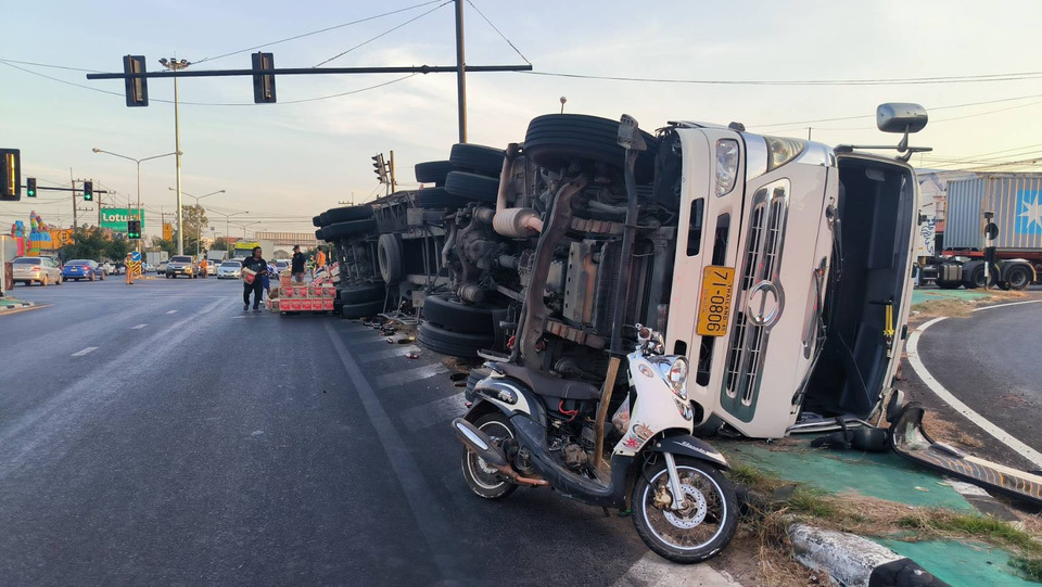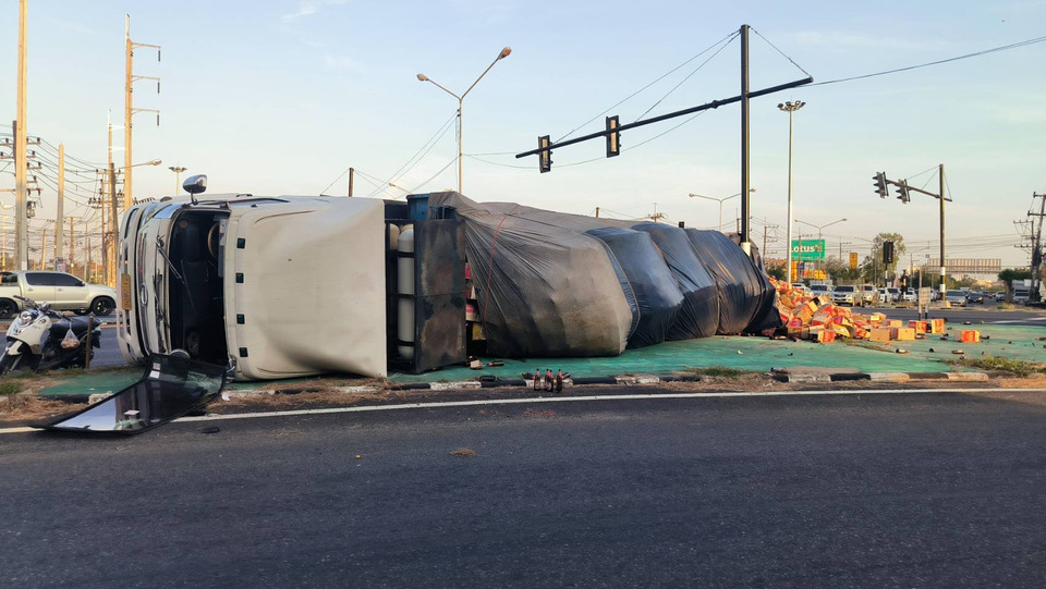 รถบรรทุกพ่วง 22 ล้อ ที่บรรทุกขวดเบียร์เปล่าจำนวน 4,000 ลัง เสียการทรงตัวพลิกคว่ำขณะกำลังหักเลี้ยวขวาบริเวณสี่แยกส่งผลให้ขวดเบียร์เปล่าที่บรรทุกมาตกกระจัดกระจายเกลื่อนถนนกรีดขวางการจราจรแต่โชคดีที่ไม่มีใครบาดเจ็บหรือเสียชีวิต