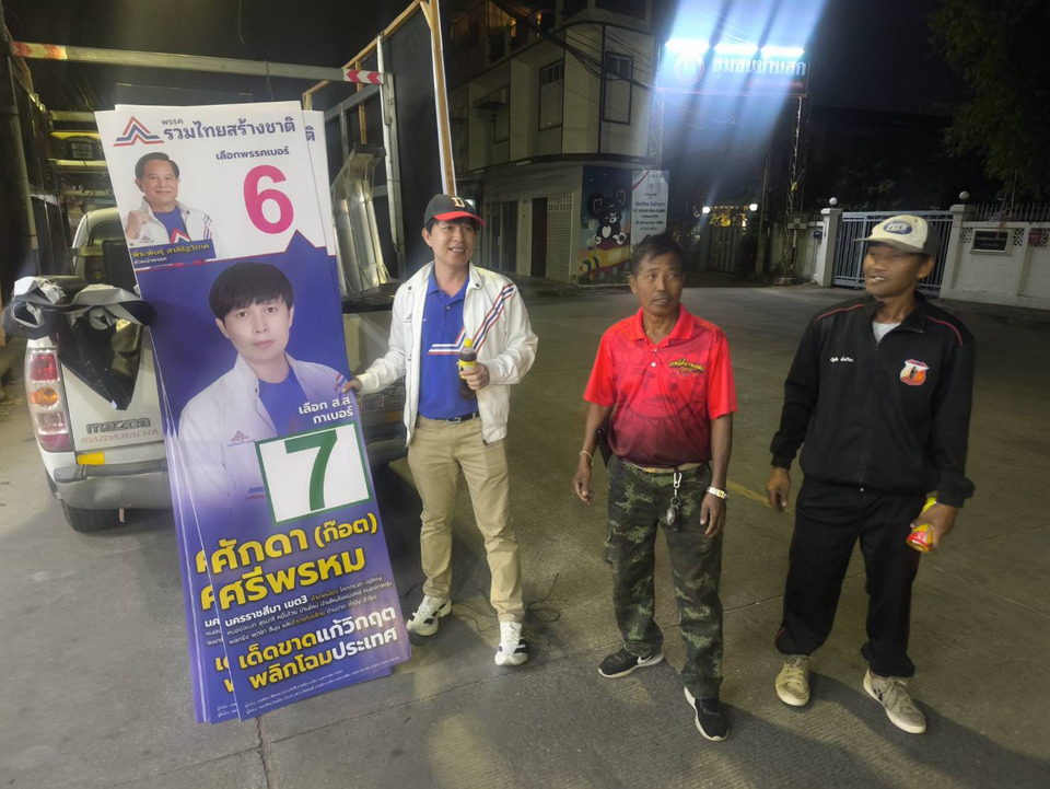 นายศักดา หรือก็อต ศรีพรหม ผู้สมัคร ส.ส เขต 3 เบอร์ 7 พรรครวมไทยสร้างชาติ และนางสาวธัญญารัตน์ หรือนก กาญจนวัฒนา ผู้สมัคร ส.ส เขต 2 เบอร์ 2 พรรคภูมิใจไทย พร้อมทีมงานได้ระดมติดป้ายในเขตเลือกตั้งตั้งแต่เช้าตรู่ ส่วนใหญ่เน้นติดตามเสาไฟฟ้า เนื่องจากทัศวิสัยการมองและมีจุดเด่นที่สามารถจดจำได้