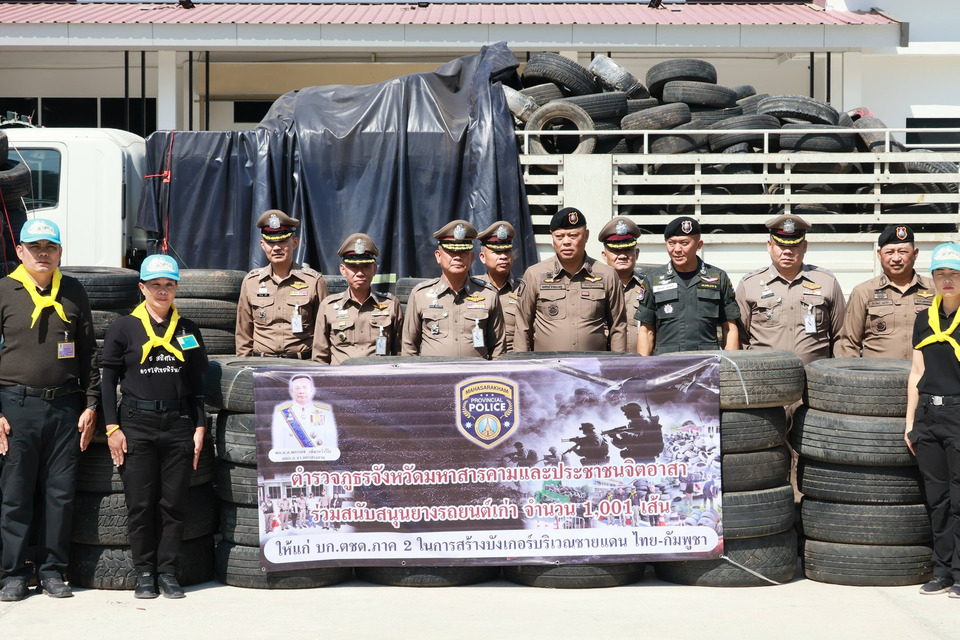 วันที่ 13 ม.ค.2569 พล.ต.ต.กิตติศักดิ์ จำรัสประเสริฐ รองผู้บัญชาการตำรวจภูธรภาค 4 พร้อมด้วย พล.ต.ต.พลาเดช เพ็ชรหว้าโง๊ะ ผู้บังคับการตำรวจภูธรจังหวัดมหาสารคาม นำข้าราชการตำรวจจาก สถานีตำรวจภูธรในสังกัด จำนวน 25 สถานี จิตอาสา 904 และจิตอาสาพระราชทาน ร่วมมอบยางรถยนต์เก่า จำนวน 1,001 เส้น สนับสนุนภารกิจ กองบังคับการตำรวจตระเวนชายแดนภาค 2 โดยมี พล.ต.ต. วุฒิพงษ์ เย็นจิตต์ ผู้บังคับการตำรวจตระเวนชายแดนภาค 2 เป็นตัวแทนรับมอบ