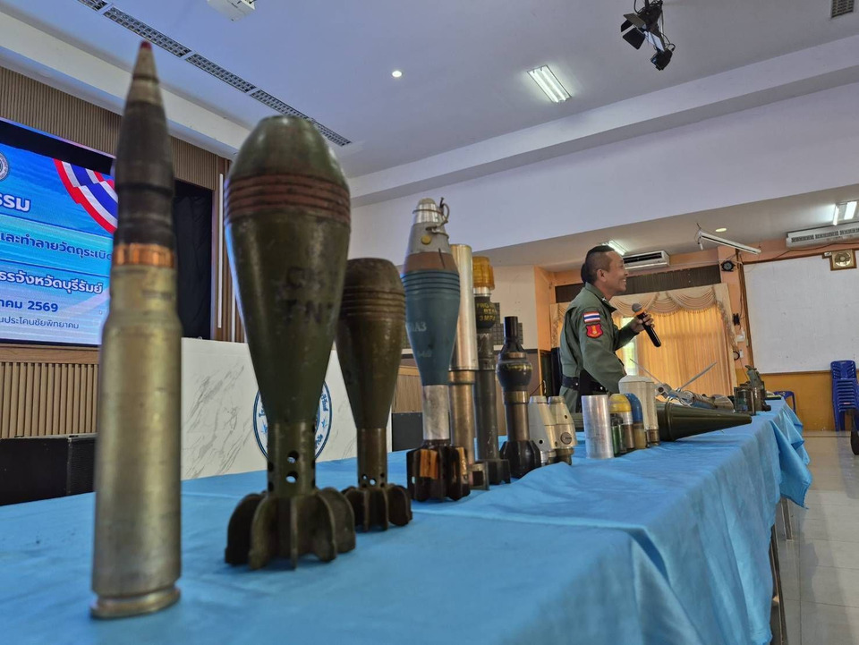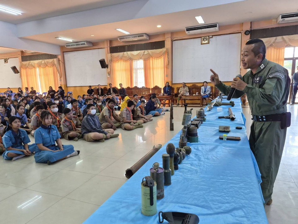ทั้งนี้ เจ้าหน้าที่ฯ ได้มีการนำวัตถุระเบิดชนิดต่างๆ ของฝ่ายกัมพูชาที่ยิงตกลงมา ซึ่งเจ้าหน้าที่ได้ทำการเก็บกู้และทำการนิรภัยปลอดภัยแล้ว ซึ่งเป็นวัตถุระเบิดที่ไม่มีชนวนระเบิด และไม่เป็นอันตรายแล้ว และบางส่วนเป็นเศษลูกกระสุนปืนใหญ่ ที่ระเบิดทำงานไปแล้ว ไม่ว่าจะเป็นเศษซากของหัวระเบิดจรวด BM 21 กระสุนปืนคอขนาดต่างๆ กระสุนปืน RPG และระเบิดสังหารบุคคล ชนิด PMN-2 ที่ทหารไทยเหยียบและขาขาดไปหลายนาย นำมาจัดแสดงประกอบการบรรยายให้ความรู้แก่นักเรียนด้วย ซึ่งได้รับความสนใจเป็นพิเศษทั้งจากทั้งนักเรียนและคณะครู