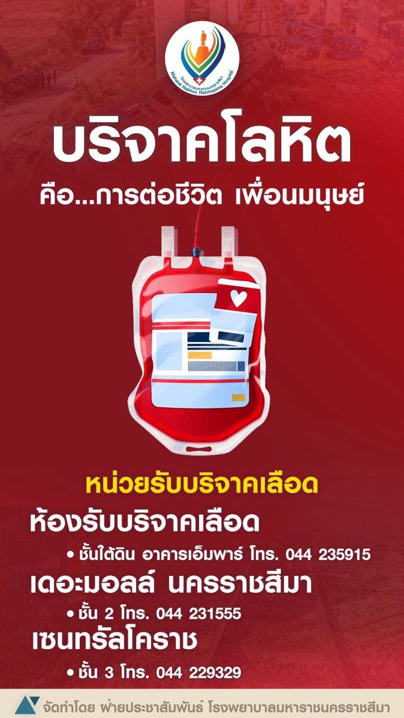 ขณะนี้เราต้องการสำรองโลหิตเป็นจำนวนมาก เพื่อช่วยเหลือชีวิตผู้บาดเจ็บ 7 ราย แจ้งความประสงค์ได้ที่ ชั้นใต้ดิน เอ็มพารค์ ชั้น 2 เดอะมอลล์ และชั้น 3 เซ็นทรัลโคราช