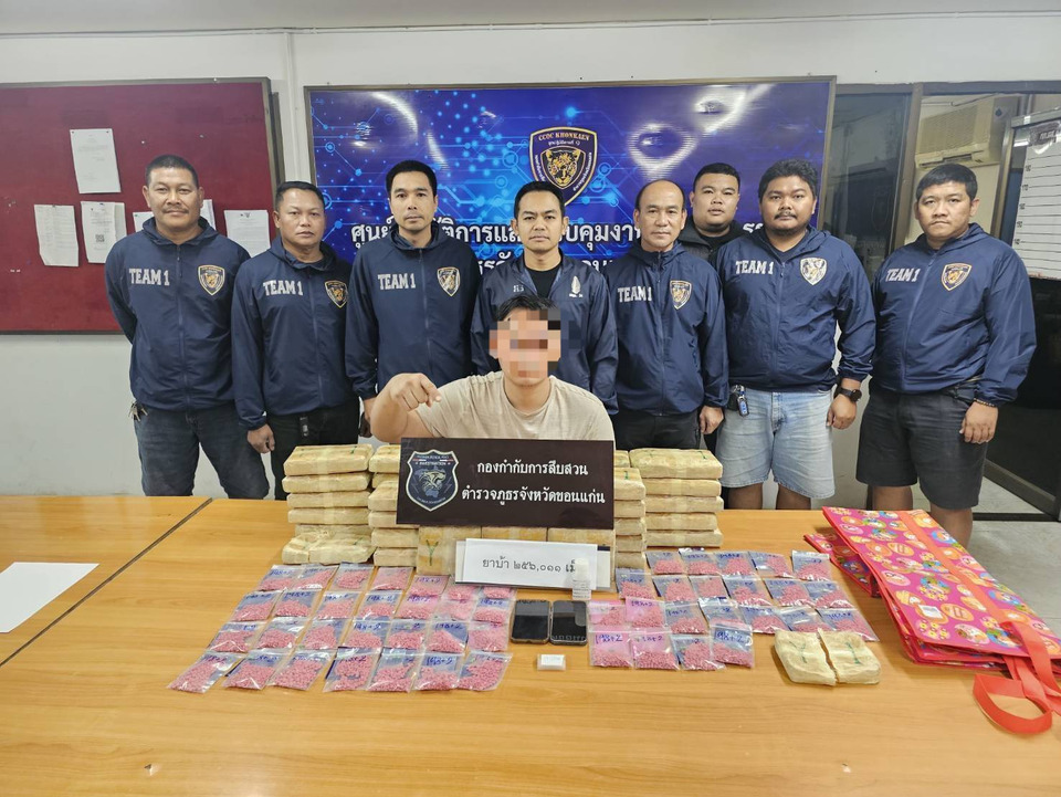เมื่อเวลา 09.30 น.วันที่ 18 ม.ค. 2569 ที่กองกำกับการสืบสวน ตำรวจภูธรจังหวัดขอนแก่น (กก.สส.ภ.จว.ขอนแก่น) พ.ต.อ.วงศกร วันชัย ผกก.สส. ภ.จว.ขอนแก่น แถลงข่าวผลการจับกุมนายศรายุทธ (สงวนนามสกุล) หรือโจ้ อายุ 31 ปี ภูมิละเนาอยู่ที่บ้านหนองบัวดีหมี ต.ท่าพระ อ.เมืองขอนแก่น จ.ขอนแก่น พร้อมของกลางยาบ้าจำนวน 265,011 เม็ด โทรศัพท์มือถือ 2 เครื่องหลังถูกเจ้าหน้าที่จับกุมตัวได้ภายในพื้นที่ป่าสาธารณะด้านหลังวิทยาลัยชื่อดังของ จ.ขอนแก่น