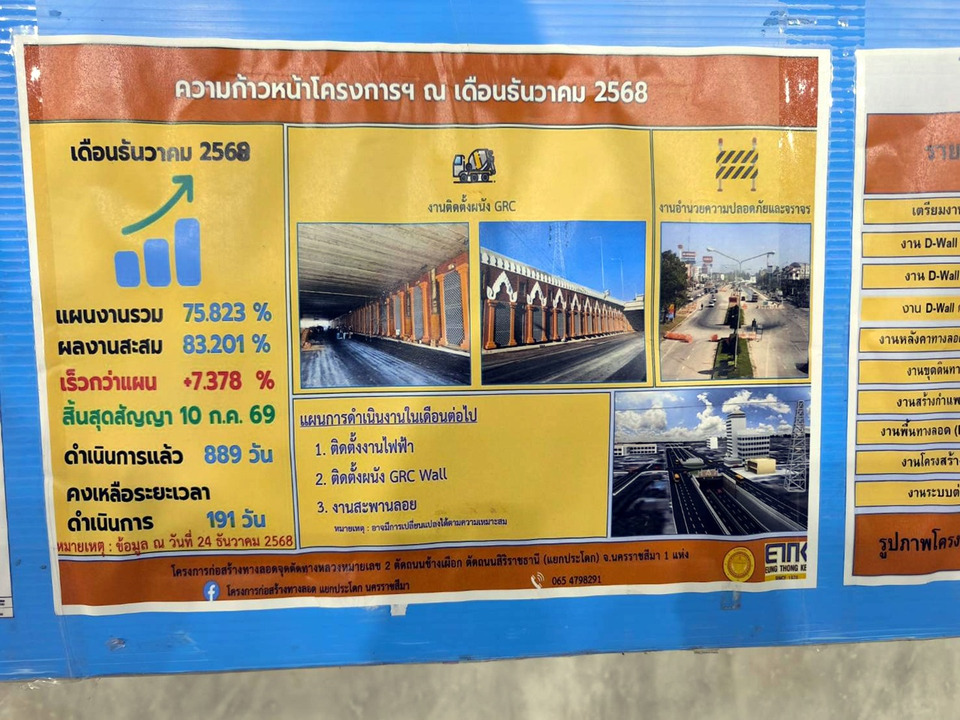 นายอาทิตย์ นายช่างอาวุโส เปิดเผยว่า ทุกขั้นตอนการก่อสร้างต้องจัดทำ EIA หรือรายงานผลกระทบสิ่งแวดล้อมทั้งก่อนและหลังดำเนินการ โดยใช้รถบรรทุกน้ำคอยรดน้ำบริเวณพื้นที่ก่อสร้างในช่วงเช้าและบ่ายหรือมีเหตุจำเป็น ส่วนรถบรรทุกได้ปิดท้ายและฉีดน้ำที่ล้อก่อนแล่นออกจากพื้นที่ก่อสร้าง ซึ่งโครงการไม่ได้ขุดดินเหมือนช่วงแรกจึงไม่น่าวิตกกังวลกับปัญหาฝุ่นละออง ส่วนเหตุการณ์บุคคลภายนอกลักลอบเข้ามาในพื้นที่ก่อสร้าง โครงการได้นำสแลมและขึงเชือกอย่างแน่หนาในเขตอันตรายพร้อมกำชับเจ้าหน้าที่รักษาความปลอดภัยเพิ่มความถี่ในการตรวจตราและประสานงานเจ้าหน้าที่ตำรวจ ผู้นำชุมชนตลอด ขณะนี้อยู่ระหว่างงานสถาปัตยกรรมและติดตั้งแผ่นสะท้อนเสียงในอุโมงค์ทางลอด มีผลงานรวม 83.201 % เร็วกว่าแผน 7.378 % แล้วเสร็จก่อนกำหนดวันที่ 10 กรกฎาคมนี้ ช่วงหลังเทศกาลสงกรานต์น่าจะสามารถเปิดใช้งานได้