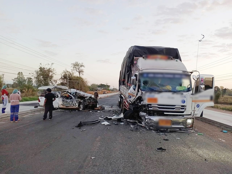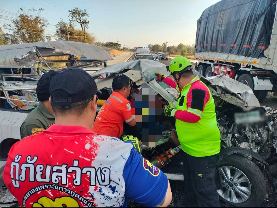 เมื่อเวลาประมาณ 06.20 น. วันที่ 22 ม.ค.69 ศูนย์วิทยุรับแจ้งเหตุฉุกเฉิน 1669 ของโรงพยาบาลยโสธรได้รับแจ้งว่ามีอุบัติเหตุรถกระบะชนประสานงากับรถบรรทุกพ่วงและมีผู้ได้รับบาดเจ็บติดคาซากรถโดยเหตุเกิดที่ถนนวารีราชเดช บริเวณก่อนถึงบ้านโคกยาว ตำบลทรายมูล อำเภอทรายมูล จังหวัดยโสธร จึงแจ้งให้อาสาฯกู้ชีพใกล้เคียงที่เกิดเหตุออกตรวจสอบเพื่อให้การช่วยเหลือผู้บาดเจ็บ โดยในที่เกิดเหตุพบว่าเป็นถนนที่อยู่ระหว่างการก่อสร้างขยายผิวจราจรโดยมีการก่อสร้างทั้ง 2 ฝั่งถนนและเว้นช่องตรงกลางถนนเพื่อให้รถใช้สัญจรไปมาได้จึงทำให้เหลือช่องจราจรที่ค่อนข้างแคบ ซึ่งในจุดเกิดเหตุเป็นทรงตรงพบว่ามีรถกระบะยี่ห้อโตโยต้ารุ่นรีโว่สีขาวคัน ทะเบียน กรุงเทพมหานคร จอดขวางถนนอยู่ในสภาพด้านหน้าพังเสียหายยุบเข้ามาถึงห้องโดยสาร ส่วนคนขับถูกอัดก๊อปปี้เสียชีวิตคาพวงมาลัยซึ่งอาสาฯกู้ภัยได้ช่วยกันนำเครื่องตัดถ่างงัดเอาร่างออกจากซากรถก่อนหน้านั้นแล้วทราบชื่อ นายวีระชัย (ขอสงวนนามสกุล) อายุ 53 ปี ชาวอำเภอนิคมคำสร้อย จังหวัดมุกดาหาร ใกล้กันพบรถคู่กรณีเป็นรถบรรทุกพ่วงยี่ห้ออีซูซุสีขาวคัน ทะเบียนมุกดาหาร จอดอยู่ในเลนของตัวเองในสภาพด้านหน้ารถฝั่งขวาพังเสียหายยับและเพลาล้อหน้าขาดออกจากตัวรถ โดยมีนายวังทอง (ขอสงวนนามสกุล) อายุ 38 ปี ชาวอำเภอปรางกู่ จังหวัดศรีสะเกษ เป็นคนขับซึ่งเดินทางมากับภรรยาได้รับบาดเจ็บเพียงเล็กน้อย