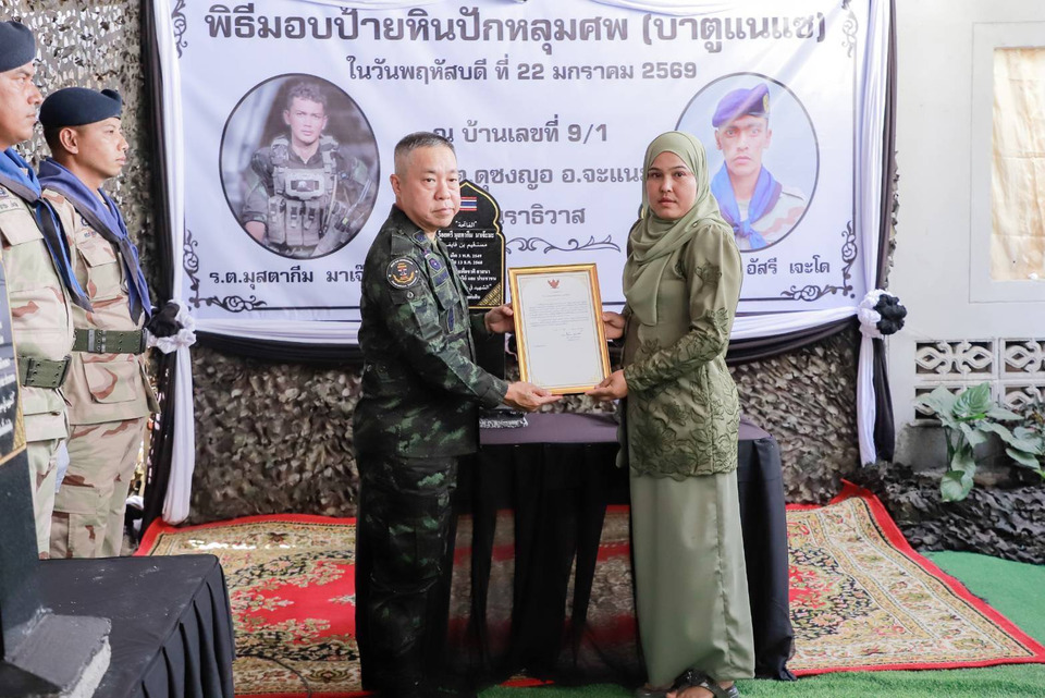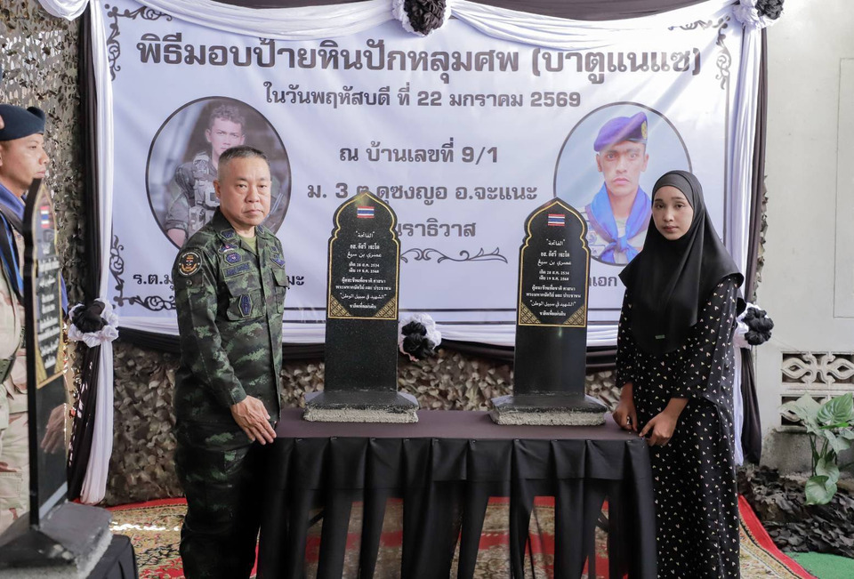 พลเอก ชัยพฤกษ์ ด้วงประพัฒน์ เสนาธิการกองทัพบก ในฐานะเลขาธิการกองอำนวยการรักษาความมั่นคงภายในราชอาณาจักร เป็นประธานในพิธีมอบป้ายหินปักหลุมฝังศพ หรือ “บาตูแนแซ” ซึ่งเป็นเครื่องหมายสำคัญตามวิถีวัฒนธรรมมลายูและศาสนาอิสลาม ใช้สำหรับปักไว้ ณ หลุมฝังศพเพื่อระบุตัวตนและเชิดชูเกียรติผู้ล่วงลับ โดยจัดขึ้นอย่างสมเกียรติเพื่อจารึกความกล้าหาญของ 2 วีรชนผู้สละชีพปกป้องมาตุภูมิ
