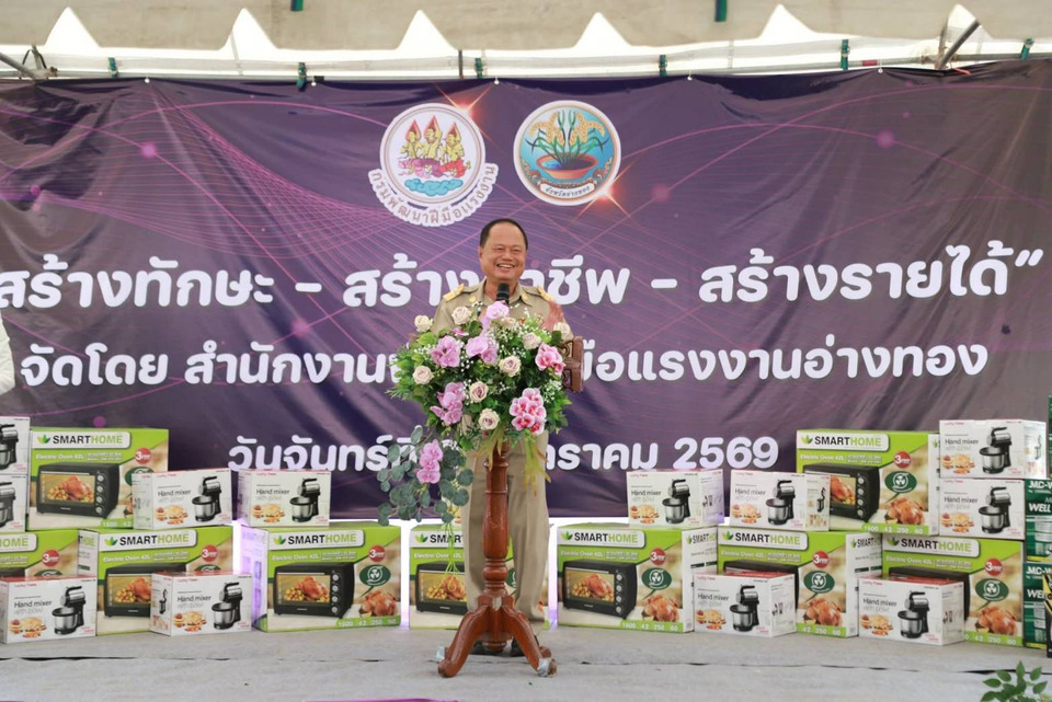 วันที่ 26 มกราคม 2569 ที่สำนักงานพัฒนาฝีมือแรงงานจังหวัดอ่างทอง นายไพบูลย์ ศุภบุญ รองผู้ว่าราชการจังหวัดอ่างทองเป็นประธานในพิธีมอบชุดเครื่องมือทำมาหากิน ภายใต้โครงการ “สร้างทักษะ สร้างอาชีพ สร้างรายได้” แก่ผู้ผ่านการฝึกอบรม จำนวน 60 คน จาก 3 หลักสูตร เพื่อเป็นการต่อยอดความรู้สู่การประกอบอาชีพอย่างยั่งยืน โดยมีหัวหน้าส่วนราชการ ตัวแทนหัวหน้าส่วนราชการข้าราชการ เจ้าหน้าที่และประชาชนเข้าร่วม โดยมีนางสาวสุนทรีย์ ชัยพิชิต ผู้อำนวยการสำนักงานพัฒนาฝีมือแรงงานจังหวัดอ่างทอง กล่าวรายงานวัตถุประสงค์ของการจัดงาน
