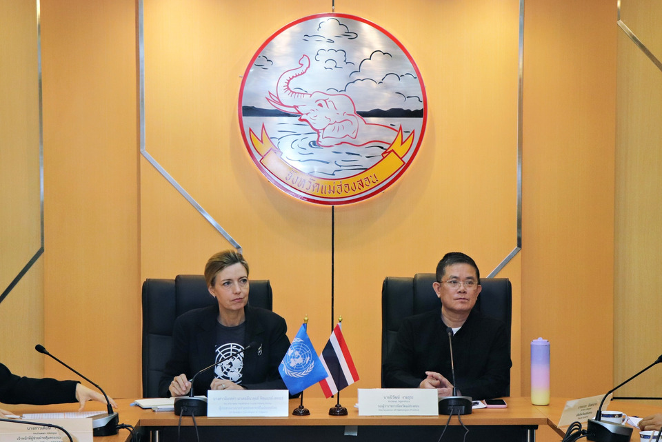 จังหวัดแม่ฮ่องสอน ให้การต้อนรับ นางสาวมิเกลล่า มาเดอลีน ลุยส์ ฟิลแบรย์ – สตอเร่ Ms. Michaela Madeleine Louise Friberg – Storey ผู้ประสานงานประจำสหประชาชาติในประเทศไทย ,คณะผู้แทนจากสหประชาชาติ และเจ้าหน้าที่สำนักงานข้าหลวงใหญ่ผู้ลี้ภัยแห่งสหประชาชาติ (UNHCR) ณ ห้องประชุมสิงหนาทบำรุง ศาลากลางจังหวัดแม่ฮ่องสอน อำเภอเมือง จังหวัดแม่ฮ่องสอน เข้าพบเพื่อเยี่ยมคารวะและหารือเกี่ยวกับสถานการณ์ชายแดน พร้อมแจ้งการดำเนินงานขององค์การสหประชาชาติในพื้นที่จังหวัดแม่ฮ่องสอน