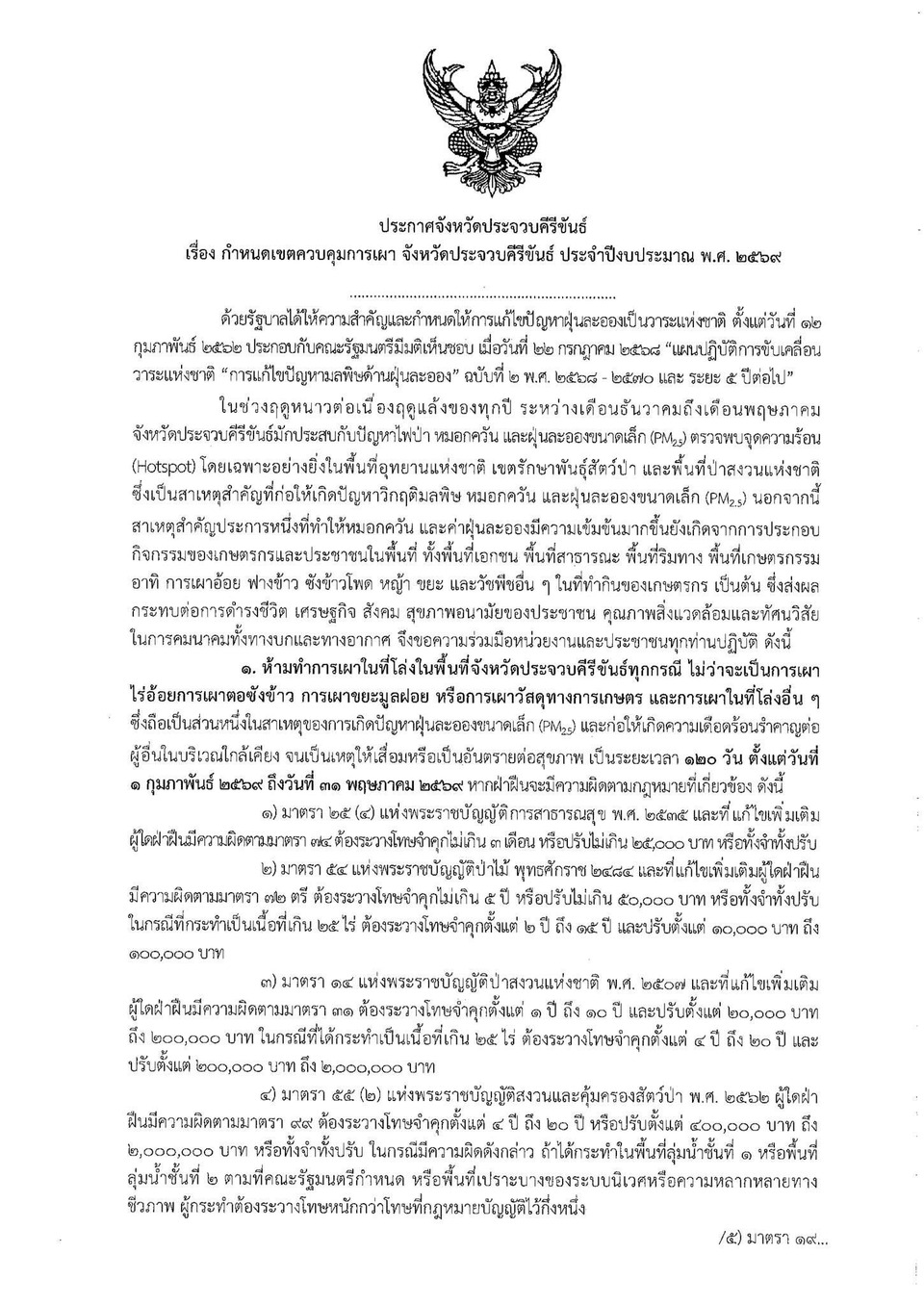 ประจวบฯ เข้ม! ประกาศห้ามเผาที่โล่ง 120 วัน หวั่นไฟป่า-ฝุ่น PM2.5 พุ่งสูง เริ่ม 1 ก.พ. ฝ่าฝืนมีโทษตั้งจำทั้งปรับ