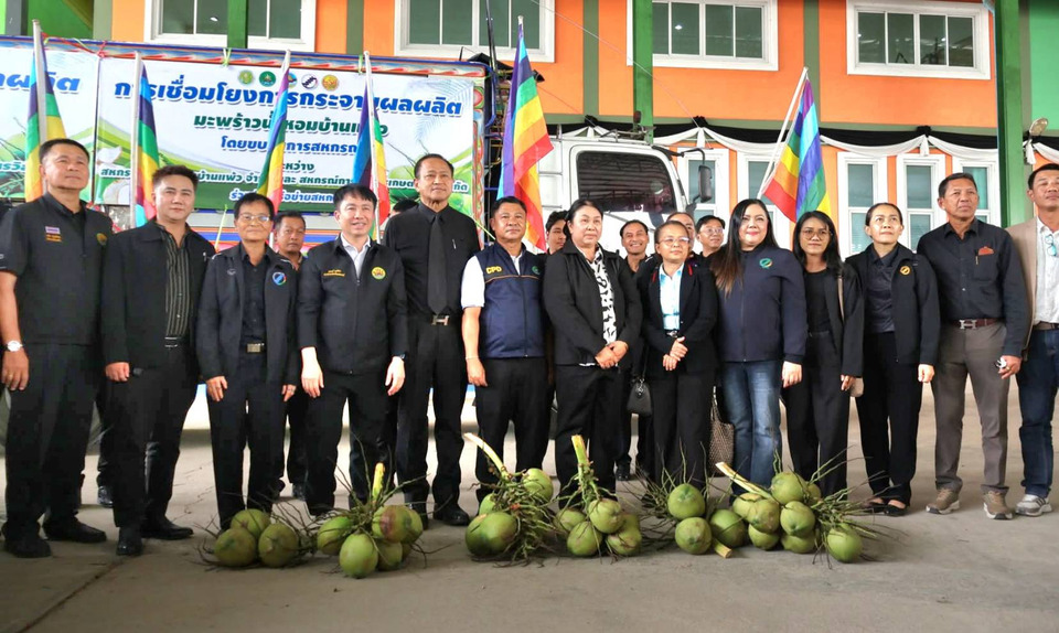 อธิบดีกรมส่งเสริมสหกรณ์ เปิดเผยว่า ในวันนี้ได้มาตรวจเยี่ยมการรวบรวมผลผลิตมะพร้าวน้ำหอมของเกษตรกรในพื้นที่จังหวัดสมุทรสาคร ขณะนี้พบว่าเกษตรกรชาวสวนมะพร้าวกำลังเผชิญปัญหาผลผลิตตกต่ำอย่างหนัก เมื่อเทียบกับเดือนกุมภาพันธ์ 2568 ราคามะพร้าวหน้าสวนเฉลี่ยลูกละ 23 - 28 บาท แต่ปัจจุบันราคาที่เกษตรกรขายหน้าสวนลดลงเหลือ ลูกละ 2 บาท กรมส่งเสริมสหกรณ์จึงหาแนวทางให้ความช่วยเหลือในเบื้องต้นเพื่อบรรเทาปัญหาและยกระดับราคาในระยะเร่งด่วน โดยใช้กลไกตลาดของเครือข่ายสหกรณ์เข้ามาช่วยแก้ปัญหาให้กับเกษตรกรชาวสวนมะพร้าวในจังหวัดสมุทรสาครและจังหวัดราชบุรี โดยมีเป้าหมายในการรวบรวมทั้ง 2 จังหวัด 1,000,000 ลูก และมีแผนกระจายผลผลิตมะพร้าวไปยังเครือข่ายสหกรณ์ในภาคตะวันออกเฉียงเหนือ 30,000 ลูก ซึ่งในวันนี้จะมีการปล่อยรถบรรทุกมะพร้าวน้ำหอมไปตลาดปลายทางที่จังหวัดร้อยเอ็ด โดยสหกรณ์การเกษตรเกษตรวิสัย จำกัด จังหวัดมหาสารคาม โดยสหกรณ์การเกษตรบรบือ จำกัด และจังหวัดยโสธร โดยสหกรณ์การเกษตรกุดชุม จำกัด สั่งซื้อจากสหกรณ์การเกษตรบ้านแพ้ว จำกัด จำนวน 20,000 ลูก ขณะที่สหกรณ์ต้นทางที่รวบรวมมะพร้าวน้ำหอมรับซื้อผลผลิตจากสมาชิกในราคาลูกละ 5 บาท และส่งขายให้เครือข่ายสหกรณ์ตลาดปลายทาง ลูกละ 6-7 บาท