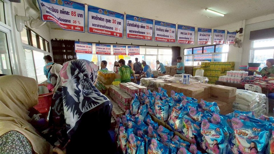 สินค้าจำเป็นลดภาระได้แก่ ข้าวหอมมะลิ 100% เพียง 100 บาท (ปกติ 157.-), ไข่ไก่เบอร์ 2 แผงละ 80 บาท (ปกติ 125.-), น้ำมันพืชขวดละ 35 บาท และน้ำตาลทรายถุงละ 20 บาท รวมทั้งมีสินค้าโอทอปขึ้นชื่อ นอกเหนือจากของใช้จำเป็น ภายในงานยังมีการนำสินค้า OTOP ชื่อดังของอำเภอควนโดนมาจำหน่าย เพื่อช่วยกระตุ้นเศรษฐกิจชุมชนให้กลับมามีชีวิตชีวาอีกครั้ง ส่วนลดสูงสุด 36%: สินค้าอุปโภคบริโภคอื่นๆ กว่า 15 รายการ ขนมาลดราคาเพื่อซับน้ำตาพี่น้องประชาชนอย่างแท้จริง