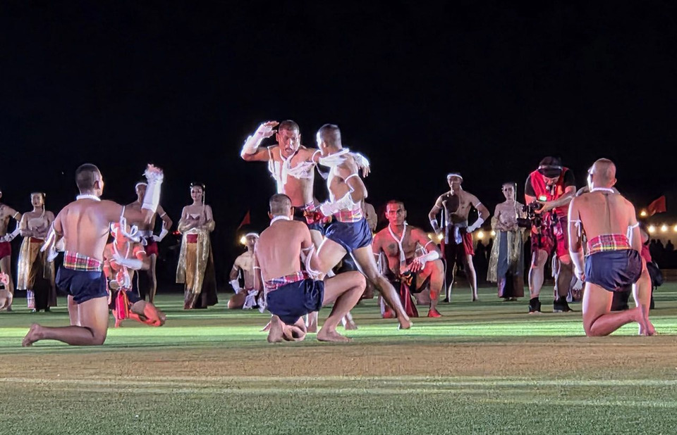 จากนั้นเป็นพิธีน้อมรำลึกพระมหากรุณาธิคุณของสมเด็จพระนางเจ้าสิริกิติ์ พระบรมราชินีนาถ พระบรมราชชนปีหลวง และยืนสงบนิ่งถวายความอาลัย 93 วินาที จากนั้นเป็นพิธีครอบครูและไหว้ครูมวยไทย การแสดงชุด "ลั่นกลองเกริกฟ้า ประกาศศักดา ภูมิปัญญามวยไทย" องค์ที่ 1 สี่ภาค สี่วิถี หนึ่งแผ่นดิน, องค์ที่ 2 บิดาแห่งมวยไทย, องค์ที่ 3 น้อมจิตบูชาครู ธำรงศิลป์ไหว้ครูมวยไทย, องค์ที่ 4 วีรกรรมทหารกล้า เลือดเนื้อเพื่ออธิปไตย "ไทยนี้รักสงบ แต่ถึงรบไม่ขาด" โดยใช้นักแสดงกว่า 1,519 คน และปิดท้ายด้วยการแสดงพลุอย่างยิ่งใหญ่ตระการตา