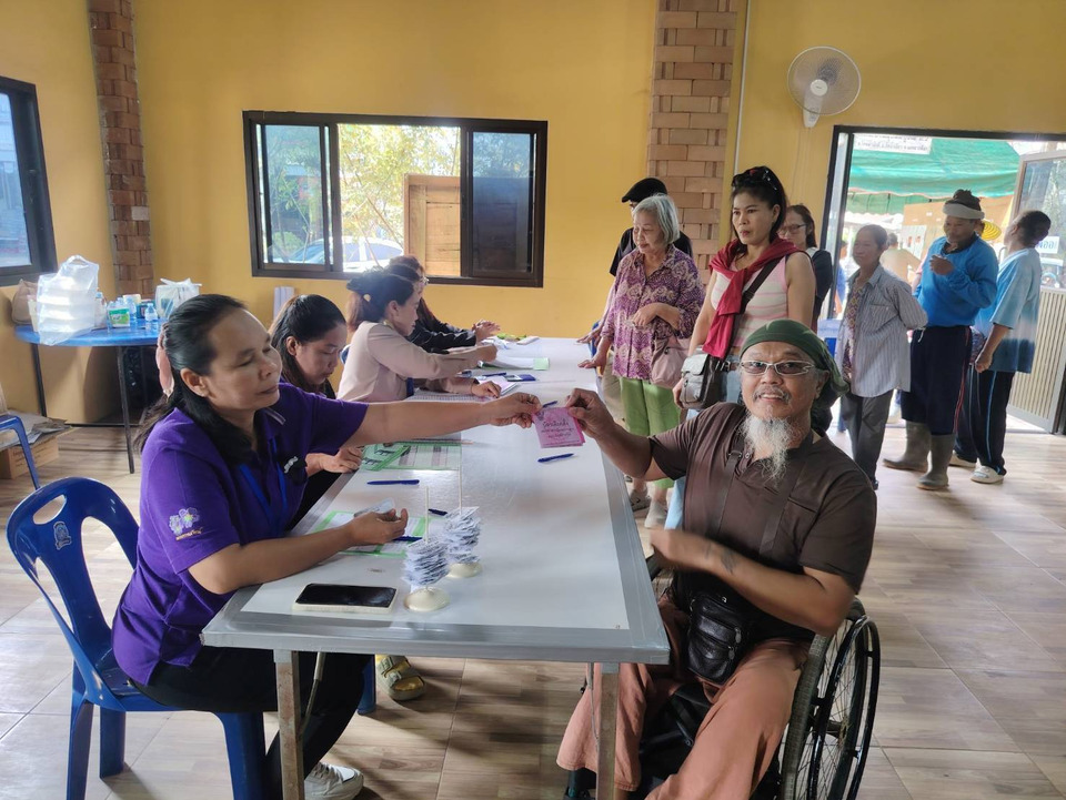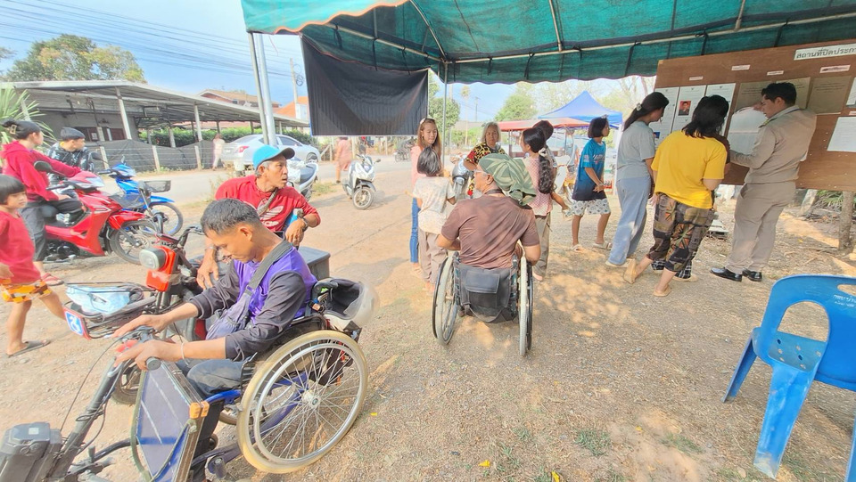 เมื่อวันที่ 8 กุมภาพันธ์ 2569 ที่ศาลาประชาคมบ้านสุขสมบูรณ์ สถานที่ตั้งหน่วยเลือกตั้งที่ 1 เขตเลือกตั้งที่ 12 ต.ไทยสามัคคี อ.วังน้ำเขียว จ.นครราชสีมา “ครูพจน์” นายคติพจน์ ฐิระฐิติ ศิลปินจิตอาสาและผู้พิการโปลิโอในฐานะหัวหน้าศูนย์พัฒนาส่งเสริมอาชีพคนพิการ อ.วังน้ำเขียว พร้อมสมาชิกคนพิการด้านการเคลื่อนไหวรวม 17 คน นั่งรถวิลแชร์พร้อมผู้ช่วยเหลือคนพิการเดินทางมาใช้สิทธิเลือกตั้ง ส.ส และออกเสียงประชามติ โดยมีกรรมการประจำหน่วยเลือกตั้ง (กปน.) และจิตอาสาคอยอำนวยความสะดวกการใช้สิทธิ โดยเข็นรถวิลแชร์และพยุงเดินเข้าไปในหน่วยเลือกตั้ง เพื่อหย่อนบัตรในคูหาเลือกตั้ง