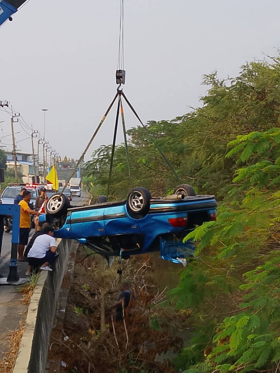 ที่เกิดเหตุพบรถเก๋งสีน้ำเงินยี่ห้อ Toyota หมายเลขทะเบียน 2 กค. 3089 จมอยู่ในน้ำทางเจ้าหน้าที่ได้ช่วยกันนำร่างผู้เสียชีวิตนั่งอยู่รถฝั่งคนขับออกมาจากรถทราบชื่อคือนายจีระศักดิ์ (สงวนนามสกุล) อายุ 47 ปี ชาวจังหวัดสกลนคร สภาพศพสวมเสื้อยืดแขนสั้นสีดำ ใส่กางเกงยีนส์ขาสั้น ตรวจสอบภายในกระเป๋าสะพายพบบัตรประชาชน เอกสารรถ ลอตเตอรี่จำนวน 4 ใบ และกุญแจรถจยย. ตรวจสอบภายในรถพบกระป๋องเบียร์ 1 กระป๋องได้ประสานรถยกนำรถเก๋งคันดังกล่าวขึ้นมาจากน้ำ