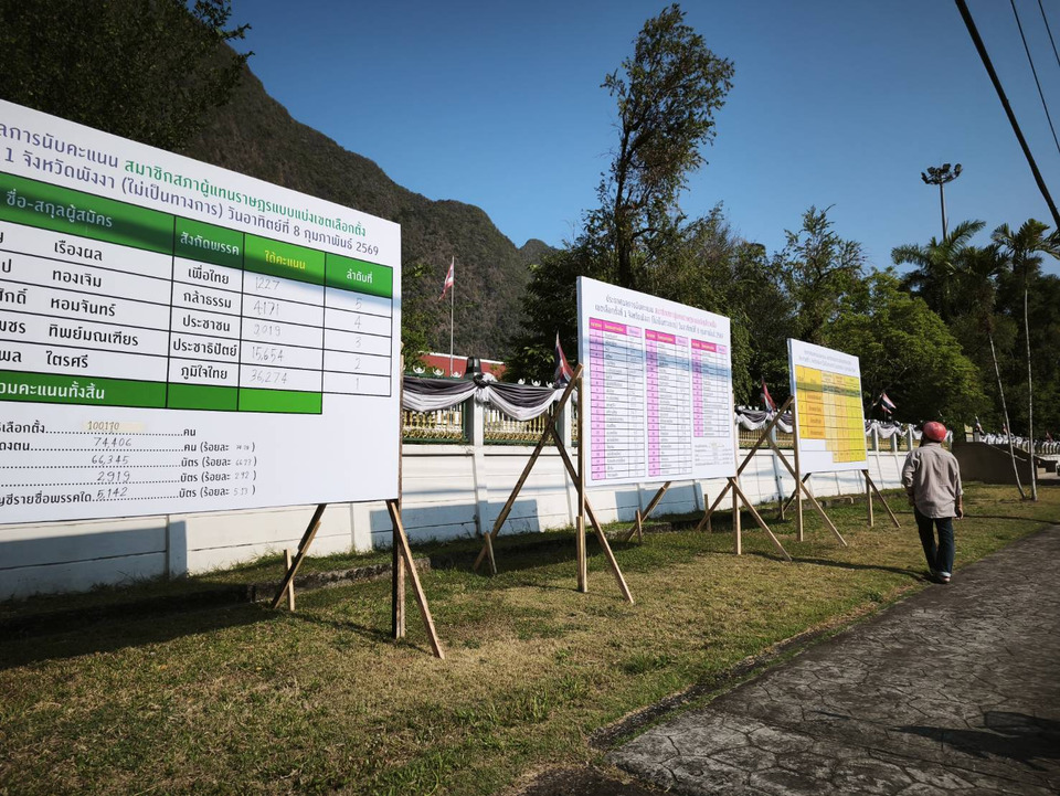 เมื่อวันที่ 9 กุมภาพันธ์ 2569 ผู้สื่อข่าวรายงานผลการนับคะแนนเลือกตั้งสมาชิกสภาผู้แทนราษฎรแบบแบ่งเขตเลือกตั้ง อย่างไม่เป็นทางการ ในเขตเลือกตั้งที่ 1 จังหวัดพังงาซึ่งประกอบด้วยพื้นที่ อำเภอเมืองพังงา อำเภอตะกั่วทุ่ง อำเภอทับปุด และอำเภอเกาะยาว เมื่อวันที่ 8 กุมภาพันธ์ 2569 ปรากฏว่า นายอรรถพล ไตรศรี ผู้สมัคร เบอร์ 5 จากพรรคภูมิใจไทย ได้รับคะแนนสูงสุด 36,274 คะแนน เขตเลือกตั้งที่ 2 ประกอบด้วย อำเภอท้ายเหมือง ตะกั่วป่า คุระบุรี และกะปง ปรากฏว่า นายฉกาจ พัฒนกิจวิบูลย์ ผู้สมัคร เบอร์ 3 จากพรรคภูมิใจไทย ได้รับคะแนนสูงสุด 26,513 คะแนน คว้าชัยชนะในการเลือกตั้งครั้งนี้ คะแนนแบบบัญชีรายชื่อ ประชาธิปัตย์นำขาดทั้ง2เขต ตามด้วยพรรคประชาชน และพรรคภูมิใจไทย