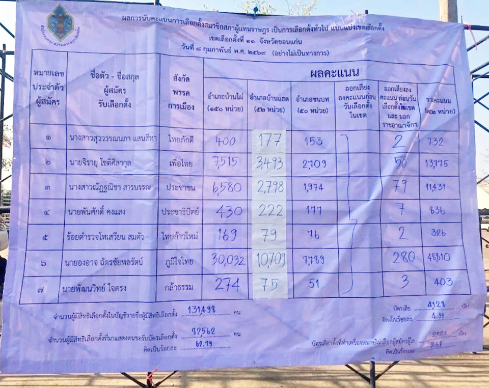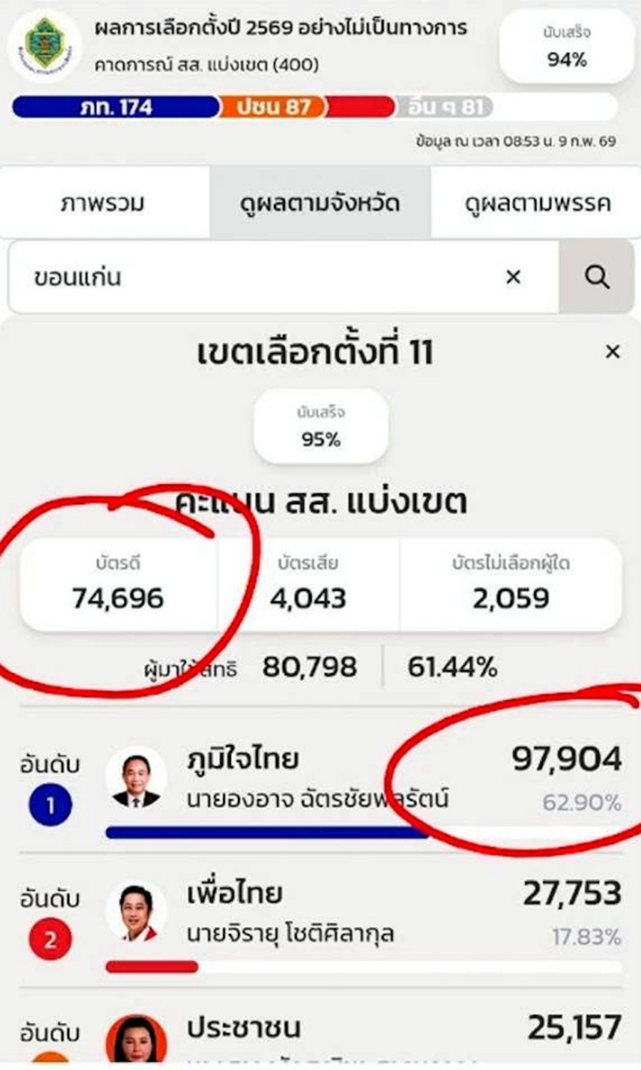 เมื่อเวลา 12.00 น. วันทีj 10 ก.พ.69 ผู้สื่อข่าวรายงานว่าโลกโซเชียลและเพจต่างๆ ทั่วทั้ง จ.ขอนแก่น ได้เผยแพร่ภาพคะแนนของผู้สมัครที่ได้รับการลงคะแนนจากผู้มีสิทธในเขตเลือกตั้งที่ 11 จากการตรวจสอบผ่านเรียลไทม์ผ่านระบบ อีซีทีรีพอร์ต ของทาง กกต. ซึ่งเข้าตรวจสอบได้ผ่านทางแอปพลิเคชั่น "SMART VOTE "โดยพบว่า ผู้สมัครที่ได้คะแนนอันดับ 1 ได้คะแนนมากกว่าบัตรดีที่มีผู้มาลงคะแนนเกินไปกว่า 2 หมื่นคะแนน โดยเป็นผู้สมัครจากพรรคภูมิใจไทย ซึ่งนับคะแนนได้ 95 เปอร์เซ็นต์ โดยได้คะแนน 97,904 คะแนน แต่บัตรดีที่มีผู้ลงคะแนนทั้งสิ้นเพียง 74,696 คน เกินมามากถึง 23,208 เสียงซึ่งภายหลังมีการเผยแพร่ภาพดังกล่าวลงในสื่อโซเชียล ปรากฏว่าคะแนนและจำนวนบัตรดี เมื่อนำมาบวกลบกับจำนวนคะแนนเสียงของผู้สมัครทุกเบอร์พบว่าไม่มีความผิดปกติในเรื่องจำนวนที่แตกต่าง แต่พบว่าจำนวนคะแนนของผู้สมัครทุกเบอร์ลดลงทั้งหมด และสอดคล้องกับจำนวนที่ทางคณะกรรมการประจำหน่วยเลือกตั้งเขตที่ 11 เขียนบนกระดานหน้าหน่วย ซึ่งนับคะแนนอย่างไม่เป็นทางการเสร็จสิ้นครบ 100% จนเกิด เสียงวิพากษ์วิจารณ์ให้กับประชาชนที่ทราบข่าวเป็นอย่างมาก ว่าสอบไปในทางทุจริตหรือไม่ ซึ่งผู้สื่อข่าวจะได้ทำการตรวจสอบกับทาง กกต.ถึงสาเหตุอีกครั้ง