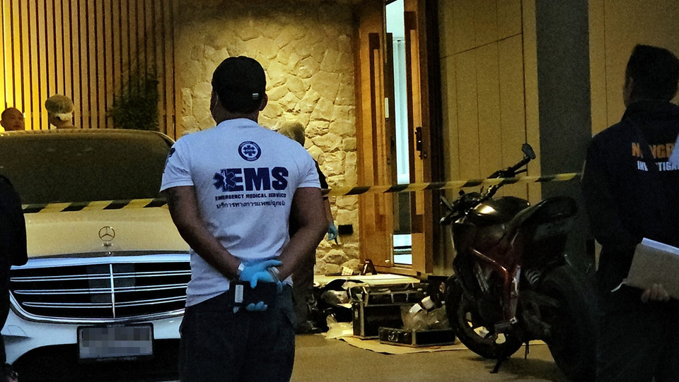 ที่เกิดเหตุเป็นหมู่บ้านหรู บ้านเป็นลักษณะบ้านเดี่ยวชั้นเดียว มูลค่าบ้านไม่ต่ำกว่า 10 ล้านบาท โรงจอดรถหน้าบ้าน มีรถตู้หรู และรถเบนซ์ จอดอยู่ เบื้องต้นจากการตรวจสอบบริเวณห้องรับแขก ซึ่งมีการเปิดแอร์เย็นฉ่ำ พบผู้เสียชีวิตเป็นชาวต่างชาติ ทราบชื่อว่า MR.WONHOA อายุ 55 ปี ชาวเกาหลีใต้ และเป็นเจ้าของบ้านในสภาพศพนอนหงายอยู่บนโซฟา สวมเสื้อแขนยาวสีน้ำเงิน กางเกงขาสั้นสีดำ มีบาดแผลถูกยิงเข้าที่หน้าอกข้างซ้าย กระสุนตัดขั้วหัวใจเสียชีวิต ที่ข้างตัวใกล้กับมือด้านขวาของผู้ตาย พบอาวุธปืนพักสั้น แบบแม็กกาซีน ขนาด 11 มม. ตกอยู่ 1 กระบอก และ ปลอกกระสุนปืนขนาดเดียวกันตกอยู่บนพรมพื้นห้อง 1 ปลอก นอกจากนี้ยังพบขวดไวน์ เพิ่งเปิดใหม่ๆ รินใส่แก้วไวน์ วางอยู่บนโต๊ะ ตำรวจจึงมีการกันพื้นที่ และให้เจ้าหน้าที่ตำรวจกองพิสูจน์หลักฐาน (พฐ.) ตรวจสอบในที่เกิดเหตุอย่างละเอียด