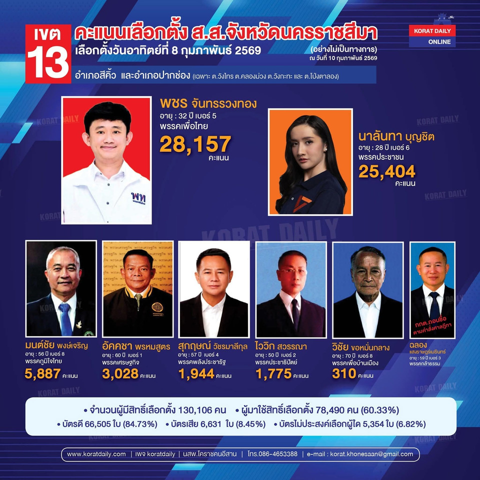 วันที่ 12 ก.พ.69 นายวัชรากร เลิศด้วยลาภ ผู้สมัคร สส.นครราชสีมา พรรคเพื่อไทย (พท.) เขต 14 พื้นที่อำเภอปากช่อง (ยกเว้นตำบลวังไทร ตำบลคลองม่วง ตำบลวังกะทะ และตำบลโป่งตาลอง) จ.นครราชสีมา ซึ่งมีผลรวมคะแนน 28,220 คะแนน เป็นลำดับที่ 2 แพ้นายหนึ่ง ขัติยะนนท์ ว่าที่ สส.พรรคประชาชน (ปชน.) ได้ 29,021 คะแนน ตามหลัง 801 คะแนน ได้เดินทางมาที่สำนักงานคณะกรรมการการเลือกตั้งประจำจังหวัด (สนง.กกต.จ.) เพื่อขอคำปรึกษากับพนักงาน กลุ่มงานสืบสวนสอบสวน กกต.จ.นครราชสีมา เนื่องจากมีข้อสงสัยการรวมคะแนนเลือกตั้ง สส. เขต 14 อาจไม่ถูกต้องครบถ้วนและไม่เป็นไปตามระเบียบของ กกต. ระบุการเลือกตั้งต้องสุจริตและเที่ยงธรรมรวมทั้งชอบด้วยกฎหมาย โดยรับการชี้แจงกรณีต้องการให้นับใหม่ “ยกทั้งเขต” จำเป็นต้องมี หลักฐานความผิดปกติชัดเจนจากทุกหน่วยเลือกตั้ง จากนั้นนายวัชรากร ได้เดินทางกลับไปรวบรวมพยานหลักฐานที่เป็นความปรากฏมายื่นร้องคัดค้านภายหลัง