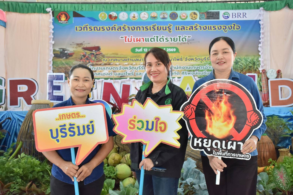 วันที่ 12 ก.พ. 69 จังหวัดบุรีรัมย์ จัดงาน “Green Gain Day” สร้างการเรียนรู้และสร้างแรงจูงใจ ไม่เผาแต่ได้รายได้ เพื่อรณรงค์ให้เกษตรกรลด ละ เลิกการเผาในพื้นที่การเกษตร หันมาใช้เทคโนโลยีและแนวทางการจัดการเศษวัสดุทางการเกษตรอย่างเป็นมิตรต่อสิ่งแวดล้อม โดยมีนายกมล โสพัฒน์ ผู้อำนวยการสำนักงานส่งเสริมและพัฒนาการเกษตรที่ 4 จังหวัดขอนแก่น เป็นประธานในพิธีเปิดงาน ที่องค์การบริหารส่วนตำบลนาโพธิ์ อำเภอนาโพธิ์ จังหวัดบุรีรัมย์