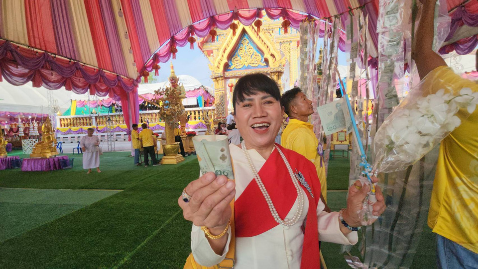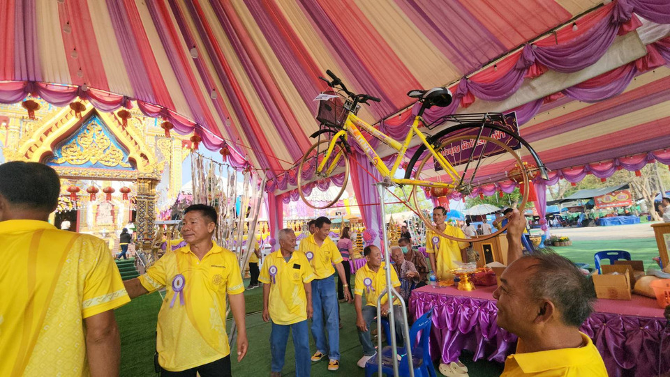 นอกจากนี้ ยังมีอีก 1 จุด ทำบุญสำคัญคือจุดบริเวณผ้าป่าลอยฟ้า ที่ทางวัดได้นำจักรยานถีบสองล้อ มาดัดแปลงเพื่อหมุนวงล้อเคลื่อนปัจจัยทำบุญขึ้นสู่หลังคาพระอุโบสถ สร้างความแปลกตาให้กับผู้ที่พบเห็นเป็นอย่างยิ่ง โดยนางสาวอาย อายุ 55 ปีนางรำ เผยว่า วันนี้ตั้งใจมารำถวายกับคณะ และเดินทางมาทำบุญ โดยจะใช้ธนบัตรฉบับนี้ ที่ลงท้ายด้วยเลข 1 G 8 2 9 3 5 7 4 มามอบให้กับเจ้าหน้าที่ เพื่อหมุนวงล้อจักรยาน นำเงินปัจจัยทำบุญขึ้นสู่พระอุโบสถ และจะนำหมายเลขธนบัตรมงคลนี้เป็นเลขเด็ดพื่อรับโชคเทศกาลตรุษจีน