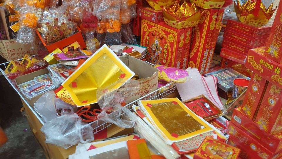 แผงจำหน่ายเนื้อสัตว์ โดยเฉพาะหัวหมูและไก่ต้ม ซึ่งถือเป็นของไหว้หลัก ได้รับความสนใจเป็นอย่างมาก หลายร้านต้องเร่งต้มสินค้าเติมหน้าร้านแทบไม่ทัน ขณะที่โซนจำหน่ายกระดาษเงินกระดาษทอง ธูปเทียน และประทัด ก็มีลูกค้าเลือกซื้อไม่ขาดสาย