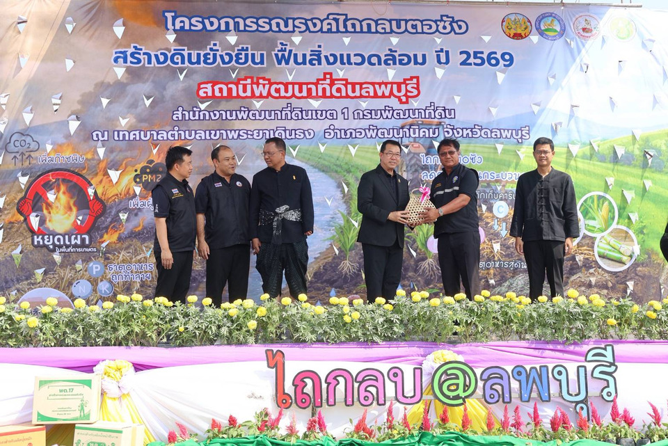 วันที่ 19 กุมภาพันธ์ 2569 นายสุรศักดิ์ เจิมสม นายกเทศมนตรีตำบลเขาพระยาเดินธง มอบไห้นายชาตรี ศรีพยัคฆ์ รองนายกเทศมนตรีตำบลเขาพระยาเดินธง พร้อมด้วย คณะผู้บริหาร ประธานสภา สมาชิกสภาเทศบาล ปลัดเทศบาล หัวหน้าส่วนราชการ ข้าราชการ พนักงานเทศบาล และพนักงานจ้าง เทศบาลตำบลเขาพระยาเดินธง เข้าร่วมกิจกรรม “รณรงค์ไถกลบตอซัง สร้างดินยั่งยืน ฟื้นสิ่งแวดล้อม” ซึ่งจัดขึ้นโดยสถานีพัฒนาที่ดินลพบุรี ประจำปี 2569 โดยมี นายบุรีรัตน์ วงศ์บุรี รองอธิบดีกรมพัฒนาที่ดิน เป็นประธานเปิดโครงการฯ ซึ่งภายในงานมี นายประยูร ศิริวรรณ รองผู้ว่าราชการจังหวัดลพบุรี พร้อมด้วย นายธนณัฐ อาจิณกิจ นายอำเภอพัฒนานิคม หัวหน้าส่วนราชการ เจ้าหน้าที่ ผู้บริการองค์กรปกครองส่วนท้องถิ่น ผู้นำชุมชน หมอดินอาสา และเกษตรกรในพื้นที่เข้าร่วมกิจกรรม