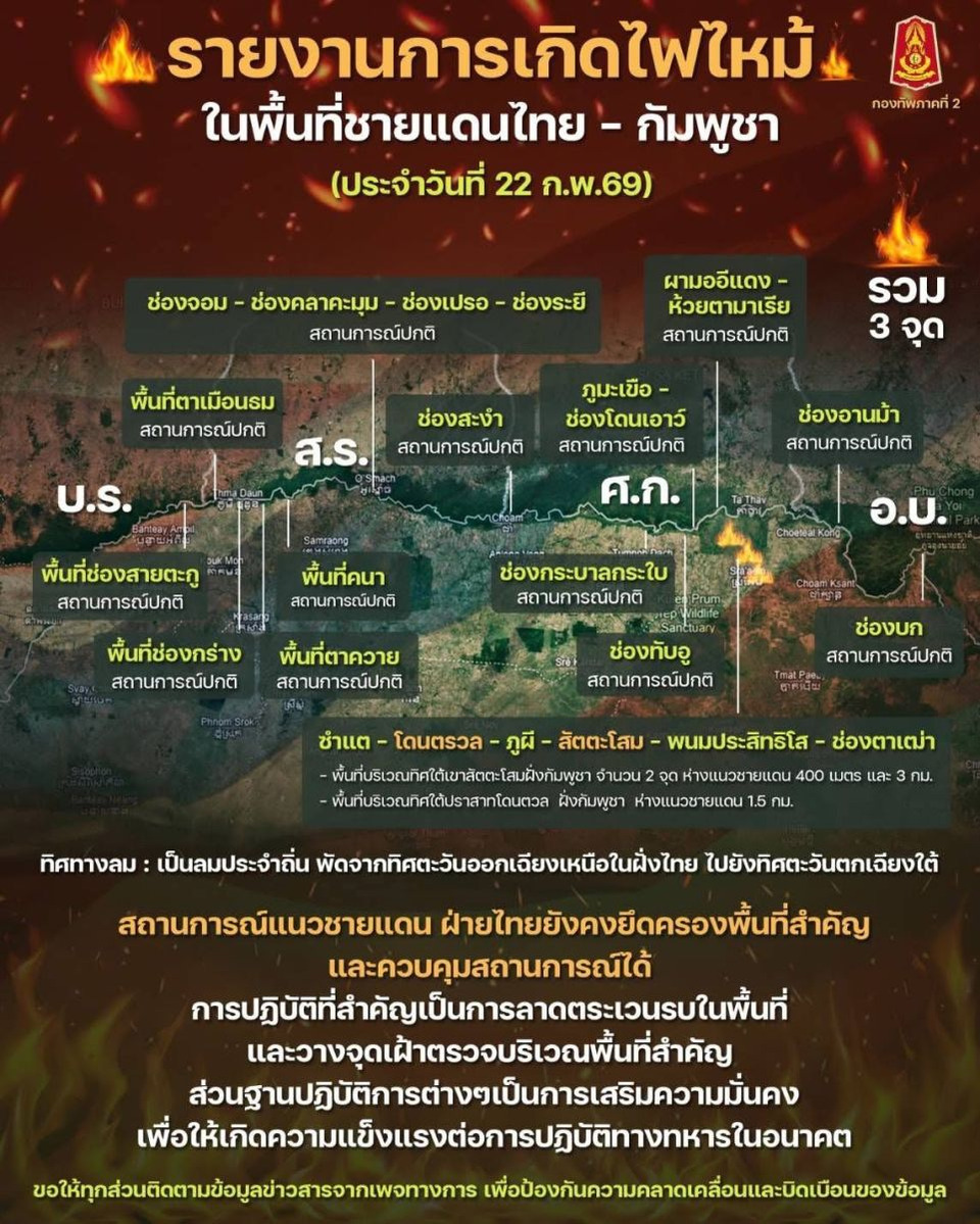 เมื่อวันที่ 22 ก.พ.69 กองทัพภาค 2 รายงานสรุปสถานการณ์ไฟไหม้ตามแนวชายแดนไทย–กัมพูชา ระบุว่า พบจุดความร้อนรวม 3 จุด ส่วนใหญ่อยู่ฝั่งประเทศเพื่อนบ้าน โดยภาพรวมฝ่ายไทยยังสามารถควบคุมสถานการณ์ได้