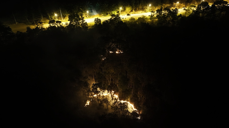 ส่วนรอบที่สอง เมื่อเวลาประมาณ 17.30 น. ห่างกันเพียงไม่กี่ชั่วโมงหลังไฟดับ พบเหตุไฟไหม้อีกครั้งบริเวณริมถนนใกล้จุดเดิม แต่ครั้งนี้เพลิงลุกลามเข้าป่าลึก ยากต่อการเข้าถึง จากการนำโดรนขึ้นบินตรวจสอบมุมสูง พบภาพที่น่าตกใจคือมีการจุดไฟพร้อมกัน 2 จุดใหญ่ใจกลางป่า ในลักษณะครึ่งวงกลมเพื่อให้ไฟลุกลามเข้าหากัน ซึ่งเป็นพฤติการณ์ที่สะท้อนถึงความตั้งใจในการวางเพลิงชัดเจน