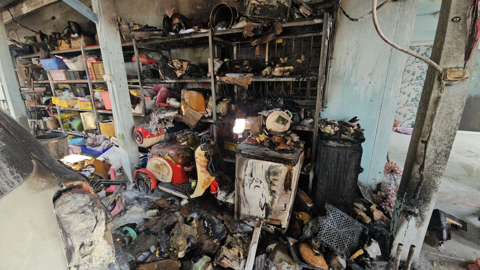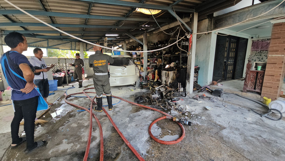 ในที่เกิดเหตุ มีบ้าน 2 หลัง อยู่ในที่เดียวกัน ตรงกลางทำเป็นที่จอดรถ ซึ่งพบเพลิงกำลังลุกไหม้บริเวณที่จอด เจ้าหน้าที่ระดมฉีดน้ำสกัดโดยใช้เวลาประมาณ 10 นาที จึงควบเพลิงไว้ได้ ตรวจสอบมีรถจักรยานไฟฟ้าเสียหายจากเพลิงไหม้ทั้งคัน รถเก๋งนิสสันมาร์ท สีขาว ทะเบียน ขธ-8681 ชลบุรี บริเวณท้ายรถด้านขวาได้รับความเสียหาย นอกจากนั้นชั้นวางของด้านข้างได้รับความเสียหายเช่นกัน