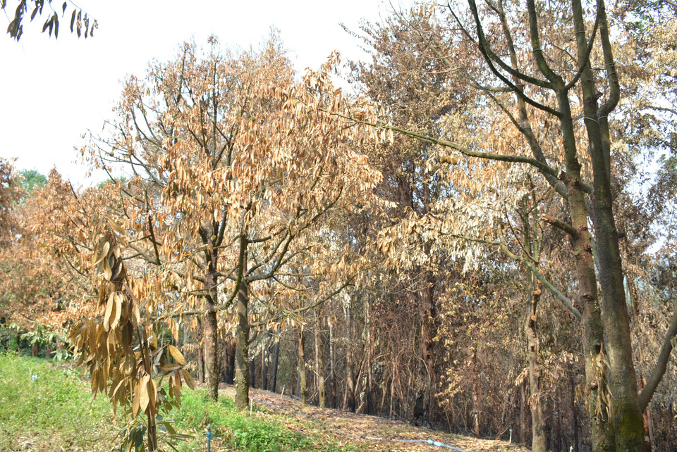 เคราะห์ร้ายครั้งนี้ลุกลามเข้าสู่พื้นที่เกษตรกรรมของ นายองอาจ พินิจไพฑูรย์ เกษตรกรชาว ต.วังแซ้ม ที่มาทำสวนในพื้นที่ อ.มะขาม โดยไฟได้ไหม้ลามเข้าสวนทุเรียนเสียหายกว่า 1 ไร่เศษ ส่งผลให้ต้นทุเรียนสายพันธุ์ "หมอนทอง" และ "มูนซันคิง" อายุเก่ากว่า 10 ปี จำนวน 40 ต้น ซึ่งกำลังติดผลดกเต็มต้นและมีกำหนดเก็บเกี่ยวในช่วงปลายเดือนเมษายนนี้ ต้องยืนต้นตายทั้งหมด สูญเสียรายได้กว่า 2 แสนบาทในพริบตา