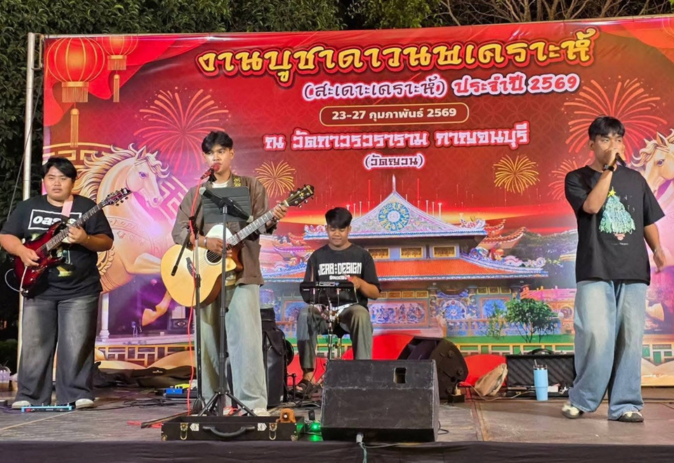 มรภ.กาญจนบุรี นำนักศึกษาดนตรีศึกษาร่วมแสดงในงานบูชาดาวนพเคราะห์ วัดถาวรวราราม จ.กาญจนบุรี ครบรอบ 192 ปี สะท้อนบทบาทมหาวิทยาลัยกับการขับเคลื่อนศิลปวัฒนธรรมท้องถิ่นและสร้าง Soft Power ผ่านเสียงดนตรี