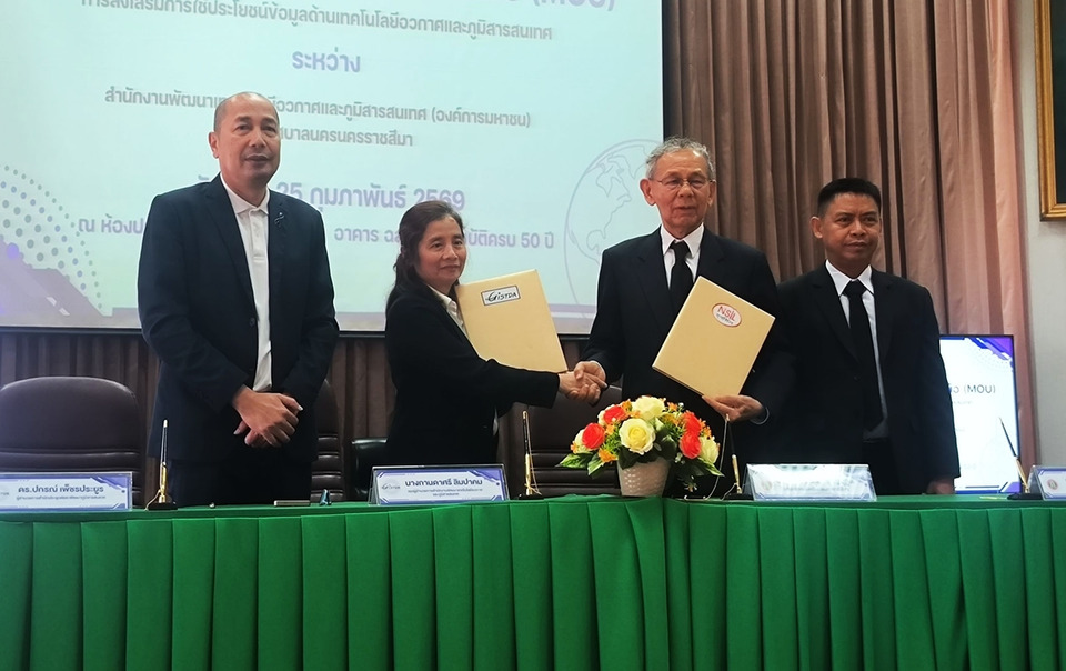 วันที่ 25 ก.พ.69 ที่ห้องประชุมกาญจนาภิเษก เทศบาลนคร (ทน.) นครราชสีมา นายแพทย์วรรณรัตน์ ชาญนุกูล นายก ทน.นครราชสีมา ลงนามบันทึกข้อตกลง (MOU) "การส่งเสริมการใช้ประโยชน์ข้อมูลด้านเทคโนโลยีอวกาศและภูมิสารสนเทศ" กับนางกานดาศรี ลิมปาคม รองผู้อำนวยการ สำนักงานพัฒนาเทคโนโลยีอวกาศและภูมิสารสนเทศ (องค์กรมหาชน) หรือ GISTDA ภายใต้กระทรวงการอุดมศึกษา วิทยาศาสตร์ วิจัยและนวัตกรรม (อว.) โดยมีผู้บริหารทั้งสองหน่วยงานรวมทั้งผู้นำชุมชนร่วมเป็นสักขีพยานและแสดงความยินดีกันอย่างชื่นมื่น