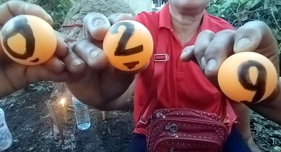 ขณะเดียวกัน หลังจากที่กราบไหว้แล้วเสร็จ ได้พากันจุดธูปจีนเสี่ยงดวงได้เลข 667 ไม่พอชาวบ้านได้พากันลุ้นจับเลขปิงปอง ได้เลข 829 พร้อมกับนำแป้งมาทาถู กับจอมปลวก บางคนเห็นเป็นเลข 62 บางคนเห็นเป็นเลข 68 ชาวบ้านจะนำเลขที่ได้นั้นจะเสี่ยงดวงในวันหวยออก หากถูกรางวัลจะนำสิ่งของและผ้า 3 สีมากราบไหว้