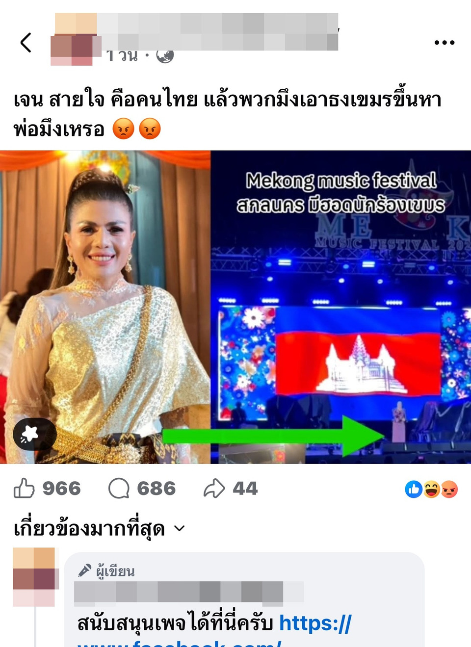 ‘เจน สายใจ’ นักร้องกันตรึมอีสานใต้ ชี้แจงดราม่าเวที Mekong Music Festival 2026 จ.สกลนคร หลังมีภาพธงชาติกัมพูชาขึ้นฉากหลังขณะร้องเพลง ยืนยันเป็นเพียงศิลปินรับเชิญ ไม่มีส่วนเกี่ยวข้องกับการจัดงาน พร้อมปฏิเสธข่าวลือมีสามีเป็นผู้ว่าฯฝั่งกัมพูชา