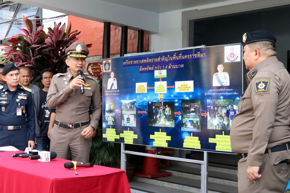 ตำรวจภูธรนครราชสีมาแถลงผลกวาดล้างเครือข่ายค้ายาเสพติดรายใหญ่ ขยายผลหลายคดี ยึดยาบ้ากว่า 300,000 เม็ด จับผู้ต้องหาหลายราย พร้อมยึดรถยนต์และทรัพย์สิน มุ่งสาวถึงนายทุนเครือข่ายชายแดนลาว