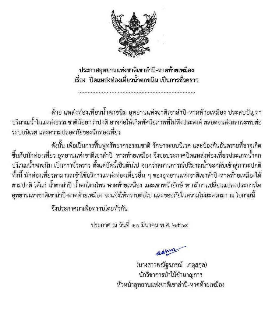 ดังนั้น เพื่อเป็นการฟื้นฟูทรัพยากรธรรมชาติ รักษาระบบนิเวศ และป้องกันอันตรายที่อาจเกิดขึ้นกับนักท่องเที่ยว อุทยานแห่งชาติเขาลำปี-หาดท้ายเหมือง จึงขอประกาศปิดแหล่งท่องเที่ยวประเภทน้ำตกบริเวณน้ำตกขนิมอุทยานแห่งชาติเขาลำปี-หาดท้ายเหมือง เป็นการชั่วคราว ตั้งแต่บัดนี้เป็นต้นไป จนกว่าสถานการณ์ปริมาณน้ำจะกลับเข้าสู่ภาวะปกติ