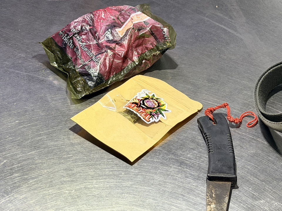 ในที่เกิดเหตุพบชายอายุ 58 ปี นั่งอยู่บริเวณโต๊ะ จึงเข้าควบคุมตัวพร้อมตรวจสอบกระเป๋าสะพาย พบว่า ซองกัญชาที่มีกัญชาอยู่ภายในจำนวนหนึ่ง พร้อมทั้งยาเส้นและมีดขนาดเล็ก 1 เล่ม ตำรวจจึงจับกุมตัวดำเนินการจับปรับสูบบุหรี่ในที่สาธารณะ ปรับเงิน 2,000 บาท และข้อหาพกพามีดติดตัวไปในเมือง หมู่บ้าน หรือที่สาธารณะโดยไม่มีเหตุอันสมควร เป็นความผิดตามประมวลกฎหมายอาญา มาตรา 371 มีโทษปรับไม่เกิน 1,000 บาท