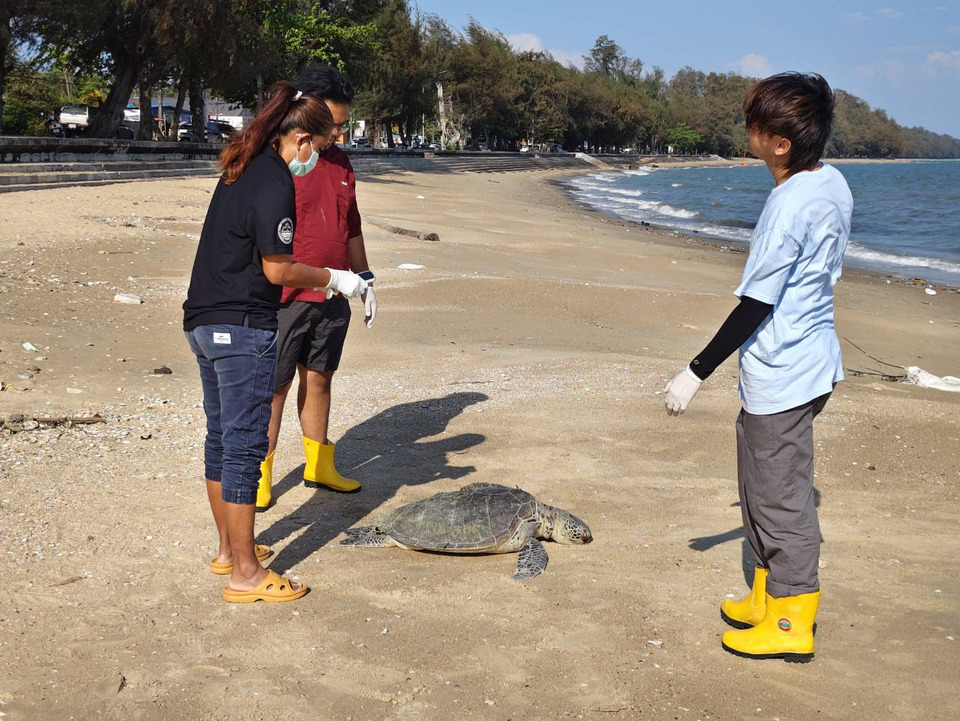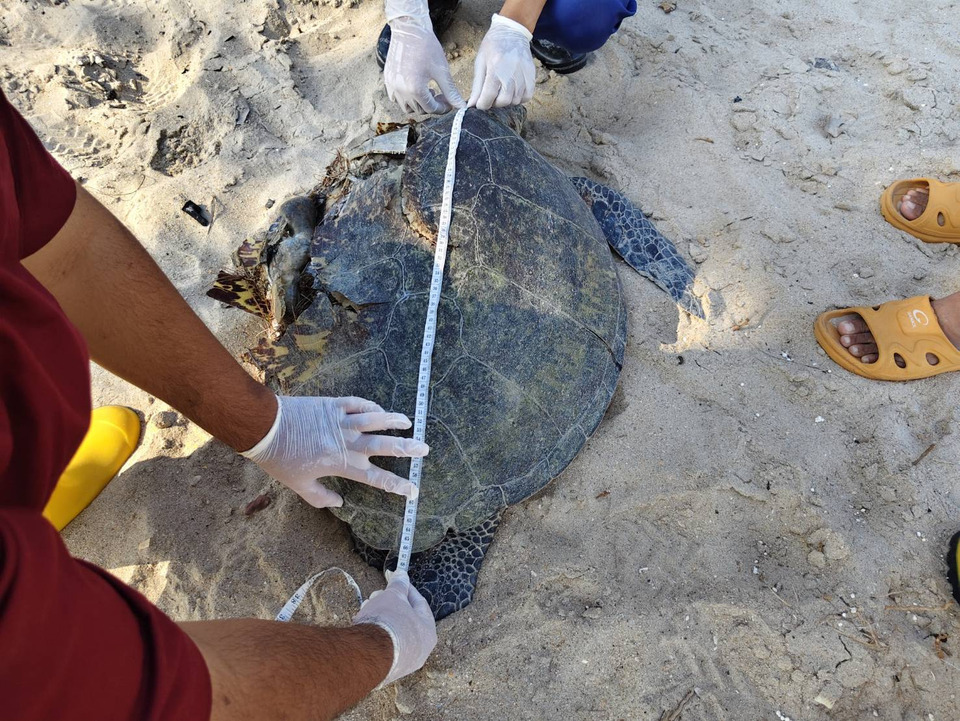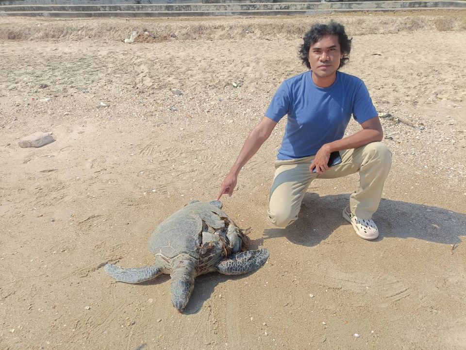 ที่เกิดเหตุพบซาก เต่าตนุ เพศเมีย น้ำหนักประมาณ 20 กิโลกรัม สภาพเริ่มเน่าเปื่อย ส่งกลิ่นเหม็นคละคลุ้งทั่วบริเวณ โดยบริเวณกระดองด้านหลังฝั่งซ้ายมีรอยแตกเปิดกว้าง เป็นบาดแผลลึกจนเห็นเนื้อด้านใน และบางส่วนของกระดองหลุดออก คาดว่าเสียชีวิตมาแล้วระยะหนึ่งก่อนถูกคลื่นซัดขึ้นมาเกยชายหาด