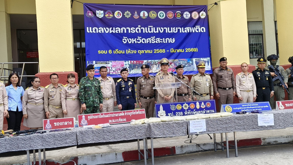 เมื่อวันที่ 12 มี.ค. 2569 ที่หน้าศาลากลางจังหวัดศรีสะเกษ นายอนุรัตน์ ธรรมประจำจิต ผวจ.ศรีสะเกษ พร้อมด้วย พล.ต.ต.ศุภชัย ศักรินพานิชกุล ผบก.ภ.จว.ศรีสะเกษ พ.อ.สุระชัย มีหอม รอง ผอ.รมน.จังหวัดศรีสะเกษ (ท.) นายสุริยา บุตรจินดา รอง ผวจ.ศรีสะเกษ นายสะอาด วงศ์รักษ์ ปลัดจังหวัดศรีสะเกษ นายอรรถสิทธิ์ ทองแสง ผบ.เรือนจำจังหวัดศรีสะเกษ พ.ต.อ.ชยากร เทศะบำรุง รอง ผบก.ภ.จว.ศรีสะเกษ พ.ต.อ.สาธิต สถิตถาวร ผกก.สส.ภ.จว.ศรีสะเกษ พ.อ.กัญญนัต ไชยโอชะ ผบ.ฉก.ทพ.23 และพ.อ.พยัคฆพล คุ้มแสง ผบ.ฉก.3 ร่วมกันแถลงผลการจับกุมเครือข่ายคดียาเสพติด ตามยุทธการ “พิฆาตทรชนคนค้ายาอีสานใต้ ภ.3” และ “238 พิทักษ์นครลำดวน” ในห้วง วันที่ 1 ต.ค. 2568 - 11 มี.ค. 2569 จับกุม 2,671 ราย ผู้ต้องหา 2,712 คน ของกลางยาบ้า 652,744 เม็ด ไอซ์ 15.42 กรัม คีตามีน 3 กรัม พร้อมยึดทรัพย์สินนักค้ายาเสพติด รวมมูลค่าประมาณ 39,700,773 บาท จับกุมตามหมายจับคดียาเสพติดข้อหาร้ายแรง 39 หมาย จับกุมหรือแจ้งข้อหาสนับสนุน/สมคบฯ 61 คดี จับกุมความผิด พ.ร.บ.ฟอกเงินฯ 1 คดี โดยผลการจากการจับกุมเปรียบเทียบ จับกุมมากกว่าปีงบประมาณ 2568 จำนวน 271 ราย