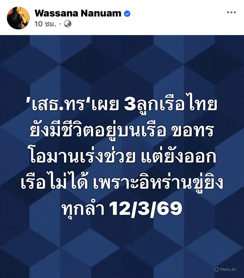ที่จ.สุรินทร์ วันที่ 13 มี.ค. 69 ผู้สื่อข่าวรายงานว่าจากกรณีเพจเฟซบุ๊กของคุณวาสนา นาน่วม ได้โพสต์พร้อมระบุข้อความว่า ’เสธ.ทร‘เผย 3 ลูกเรือไทย ยังมีชีวิตอยู่บนเรือ ขอทรโอมานเร่งช่วย แต่ยังออกเรือไม่ได้ เพราะอิหร่านขู่ยิงทุกลำ 12/3/69 โดยโพสต์ดังกล่าวนับว่าเป็นข่าวดี ที่ทางเจ้าหน้าที่ได้ค้นพบสัญญาณชีพของลูกเรือทั้ง3คน ที่เป็นผู้สูญหายบน “เรือมยุรี นารี ” ที่ถูกทางฝั่งของอิหร่านโจมตี บริเวณช่องแคบฮอร์มุซ เมื่อวันที่11 มี.ค.69 ที่ผ่านมา