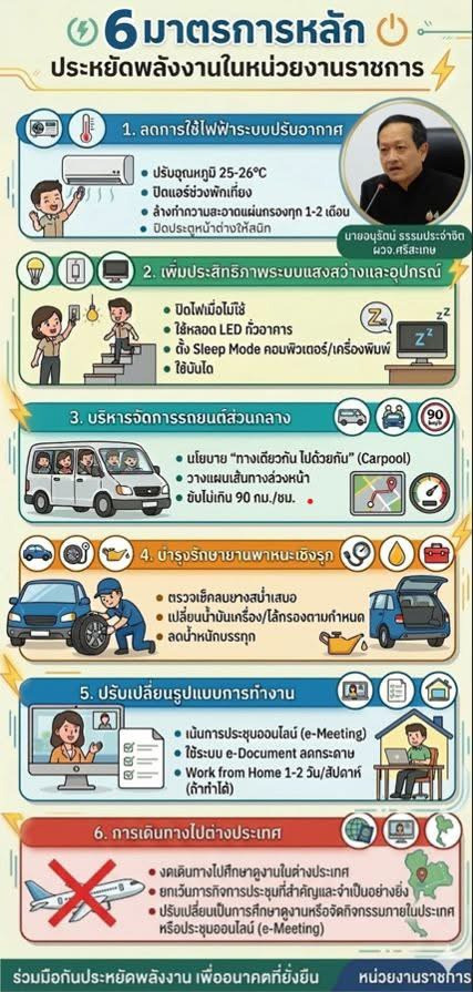 นอกจากนี้ ยังให้บริหารจัดการรถยนต์ส่วนกลางอย่างเหมาะสม โดยส่งเสริมนโยบายเดินทางร่วมกัน หรือคาร์พูล วางแผนเส้นทางล่วงหน้า และกำหนดความเร็วไม่เกิน 90 กิโลเมตรต่อชั่วโมง ขณะเดียวกันให้หน่วยงานดูแลบำรุงรักษายานพาหนะอย่างสม่ำเสมอ เช่น ตรวจเช็คลมยาง เปลี่ยนน้ำมันเครื่องตามกำหนด และลดน้ำหนักบรรทุก เพื่อช่วยประหยัดเชื้อเพลิง ในด้านการทำงาน ยังเน้นปรับรูปแบบการทำงานสู่ระบบดิจิทัล เช่น การประชุมออนไลน์ การใช้ระบบเอกสารอิเล็กทรอนิกส์เพื่อลดการใช้กระดาษ และการทำงานจากที่บ้านในบางช่วงเวลาที่เหมาะสม ส่วนการเดินทางไปศึกษาดูงานต่างประเทศ ให้ชะลอหรือหลีกเลี่ยง หากไม่จำเป็น โดยปรับเป็นการประชุมออนไลน์ หรือจัดกิจกรรมภายในประเทศแทน