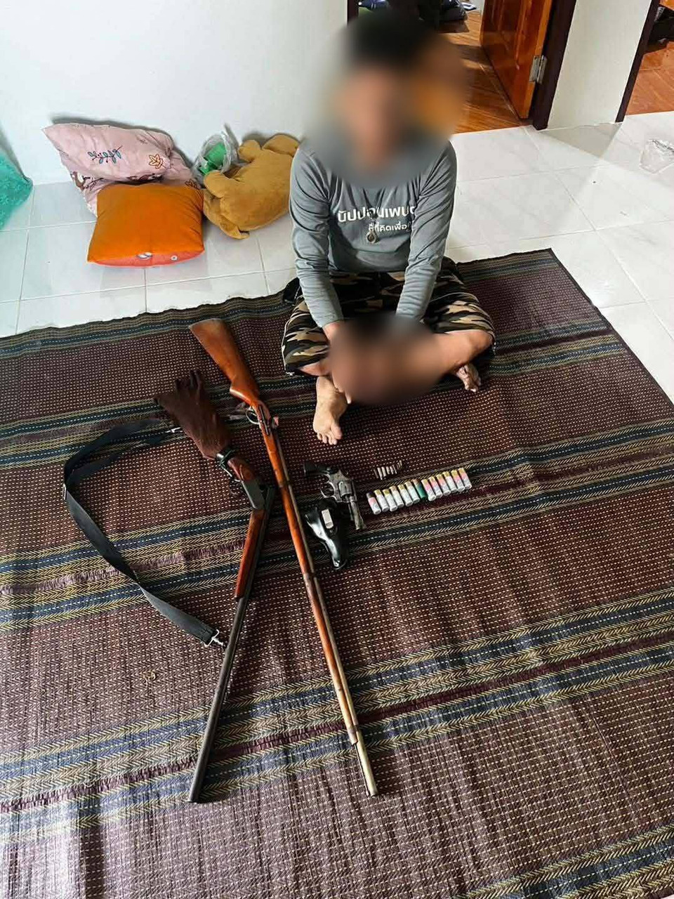 วันที่ 18 มี.ค. 69 พ.ต.อ.กฤษฎ์นิธิทัต พงธนณัชเมธาพร ผกก.สภ.หนองกรับ จ.ระยอง พร้อมด้วย พ.ต.ท.สาธิต เหลืองสกุล รอง ผกก.สส. พ.ต.ท.สุพจน์ หมั่นดี สว.สส. และกำลังเจ้าหน้าที่ชุดสืบสวน ร่วมกันจับกุมนายสมยศ ภายในบ้านพัก พร้อมของกลางยาบ้า 251 เม็ด อาวุธปืนลูกซอง 1 กระบอก ปืนยาว (แก๊ป) ไม่มีทะเบียน 1 กระบอก ปืนลูกโม่ไม่มีทะเบียน 1 กระบอก พร้อมซองหนัง ปืนยาวอัดลม 1 กระบอก และเครื่องกระสุนหลากหลายขนาด ทั้งลูกซอง .38, .380, 9 มม. และ .22 รวมหลายรายการ นอกจากนี้ยังตรวจยึดรถยนต์กระบะโตโยต้า ไมตี้เอ็กซ์ สีขาว 1 คัน ไว้เป็นของกลาง