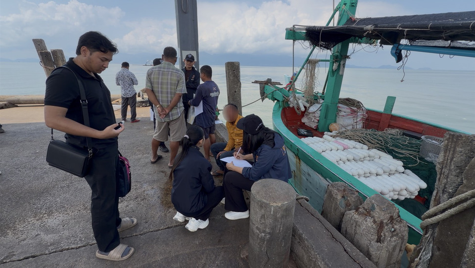 จากการตรวจสอบเบื้องต้น พบเป็นเรือประมงขนาด 28.91 ตันกรอส บนเรือมีไต๋เรือชาวไทย 1 คน ชื่อนายบุญมา (สงวนนามสกุล) และลูกเรือชาวกัมพูชา 6 คน โดยมีนายสุธี (สงวนนามสกุล) เป็นเจ้าของเรือ เมื่อเจ้าหน้าที่ตรวจสอบเอกสารอย่างละเอียดพบลูกเรือทำผิดกฎหมาย 3 ราย แบ่งเป็น 2 ราย ที่ไม่มีพาสปอร์ตและใบอนุญาตทำงาน ส่วนอีก 1 ราย มีใบอนุญาตทำงานแต่พาสปอร์ตหมดอายุ เจ้าหน้าที่จึงได้ควบคุมตัวลูกเรือทั้ง 3 ราย พร้อมไต๋เรือและเจ้าของเรือเพื่อดำเนินคดีตามกฎหมาย พร้อมทั้งอายัดเรือประมง เครื่องมือประมง และของกลางเป็นปลาอินทรีน้ำหนักประมาณ 100 กิโลกรัมไว้ตรวจสอบ