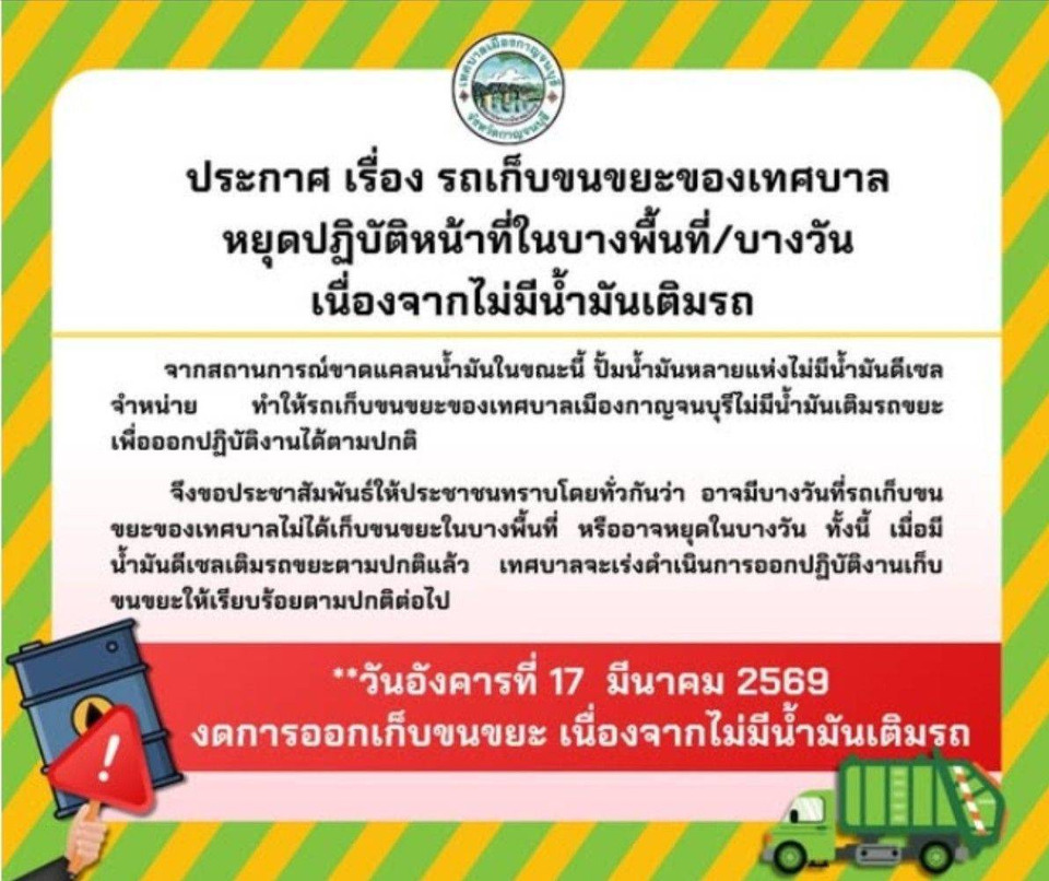 วันที่ 17 มีนาคม 2569 เทศบาลเมืองกาญจนบุรีได้ออกประกาศแจ้งประชาสัมพันธ์ถึงพี่น้องประชาชนในเขตพื้นที่รับผิดชอบ เรื่องการปรับเปลี่ยนตารางการปฏิบัติงานเก็บขนขยะมูลฝอย เนื่องจากสถานการณ์ขาดแคลนน้ำมันเชื้อเพลิงในปัจจุบัน ส่งผลให้ปั๊มน้ำมันหลายแห่งไม่มีน้ำมันดีเซลจำหน่าย ทำให้รถขนขยะของเทศบาลไม่สามารถเติมน้ำมันเพื่อออกปฏิบัติงานได้ตามปกติในบางพื้นที่และบางวัน